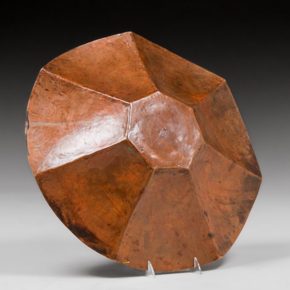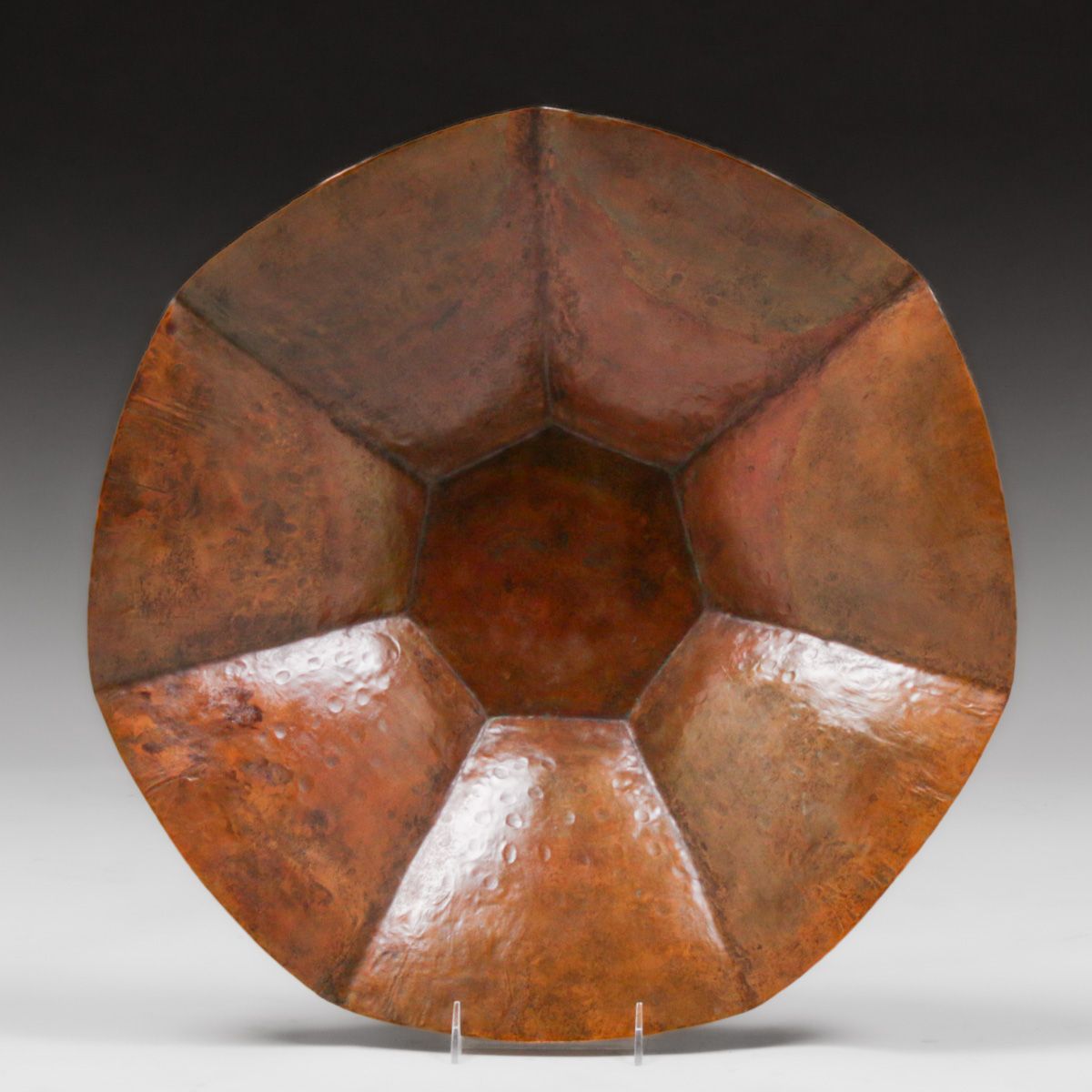 Large Dirk van Erp Hammered Copper Seven-Sided Fruit Bowl c1915-1925. Signed with open-box, San Francisco mark. Excellent original patina. 19"d x 4"h.