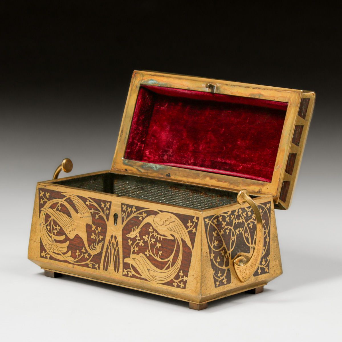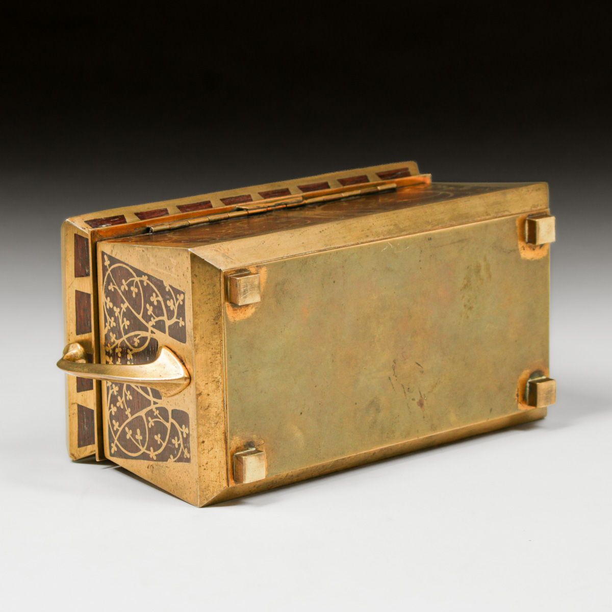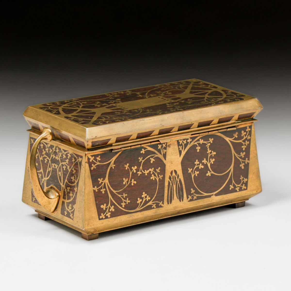 Erhard & Sohne – German Arts & Crafts Mahogany & Brass Jewelry Box c1905. Unsigned. Excellent original patina. Erhard & Sohne was granted the world patent for the manufacture of brass inlay in 1904. 4.5”h x 9.5”w x 14.25”d