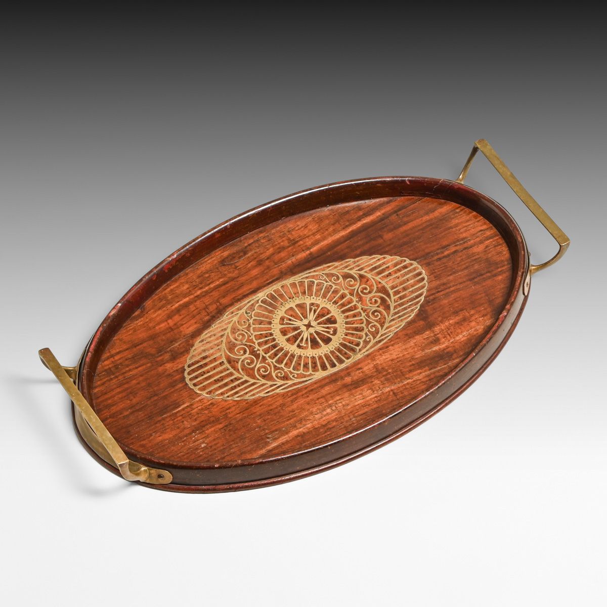 Erhard & Sohne – German Arts & Crafts Mahogany & Brass Two-Handled Tray c1905. Unsigned. Excellent original patina. Erhard & Sohne was granted the world patent for the manufacture of brass inlay in 1904. 15.25"w x 9 1/8"