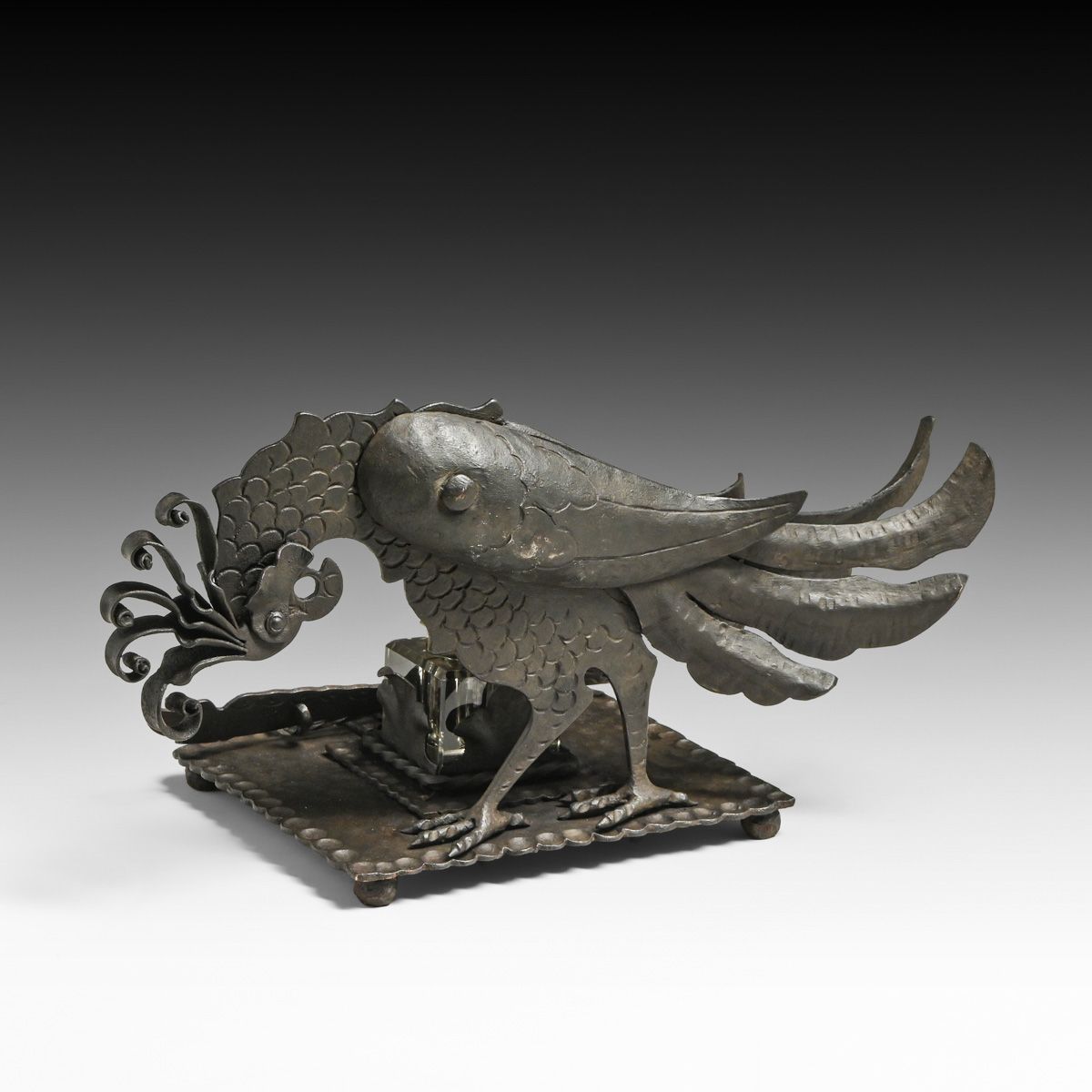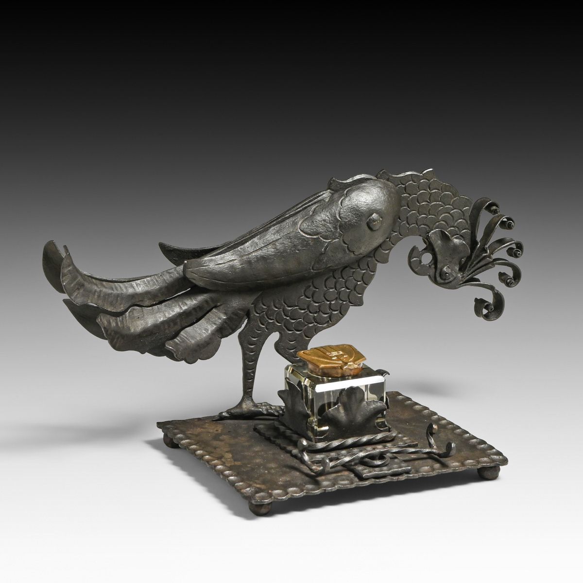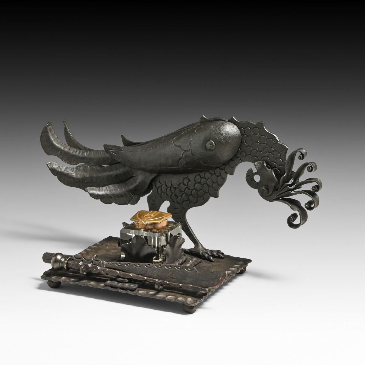German Jugendstil Arts & Crafts Iron Pheasant Inkwell Set c1900s. Unsigned. Excellent original patina. 13"w x 6.75"h x 6.25"d