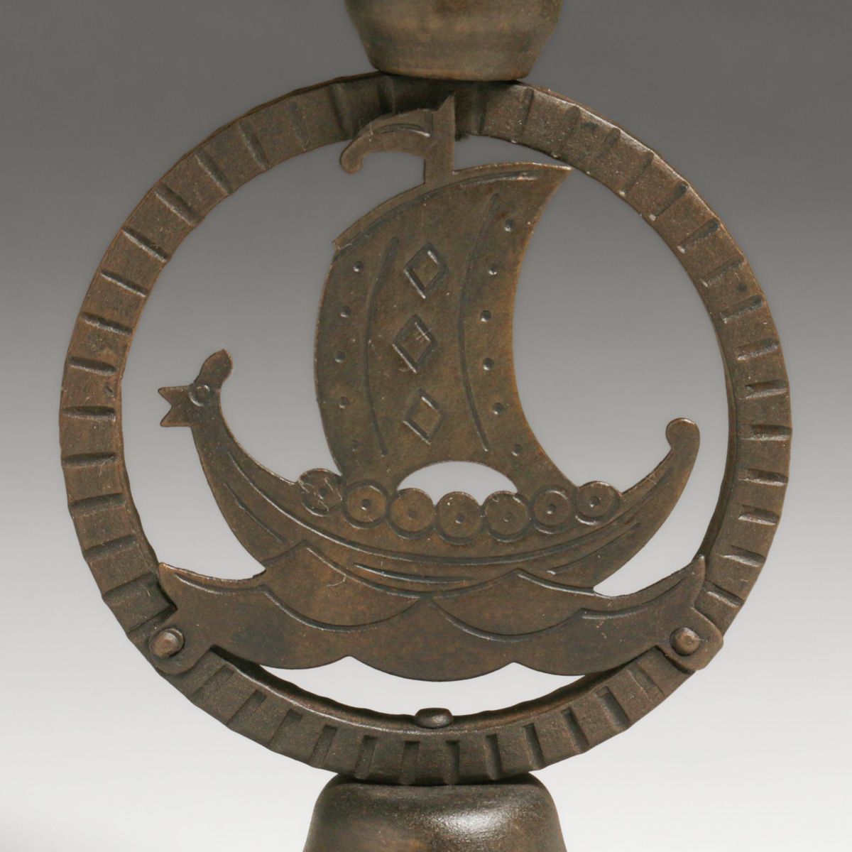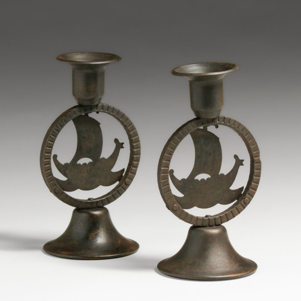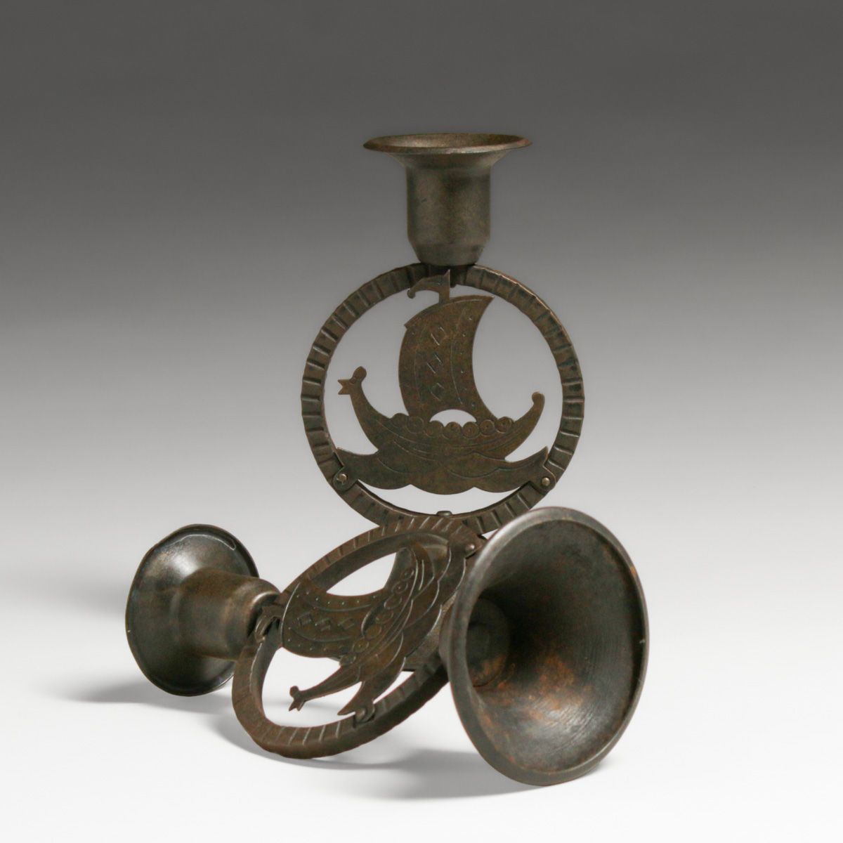 Goberg - German Viking Ship Cutout Iron Candlesticks c1905. Signed. Excellent original patina. 6.5"h x 3.5"w x 3"d