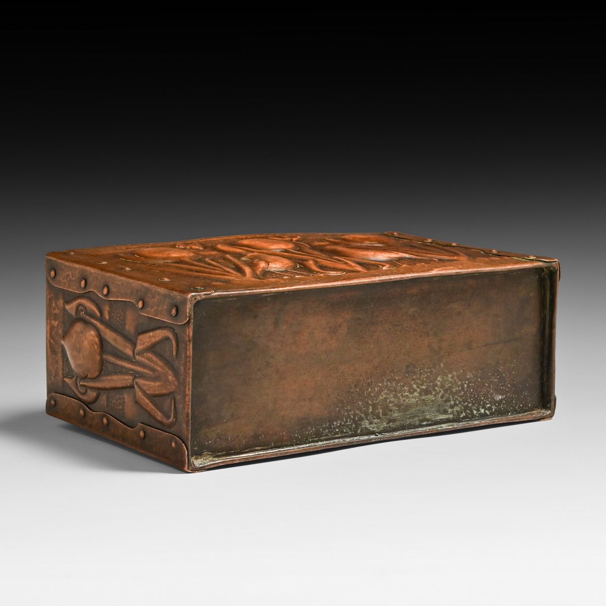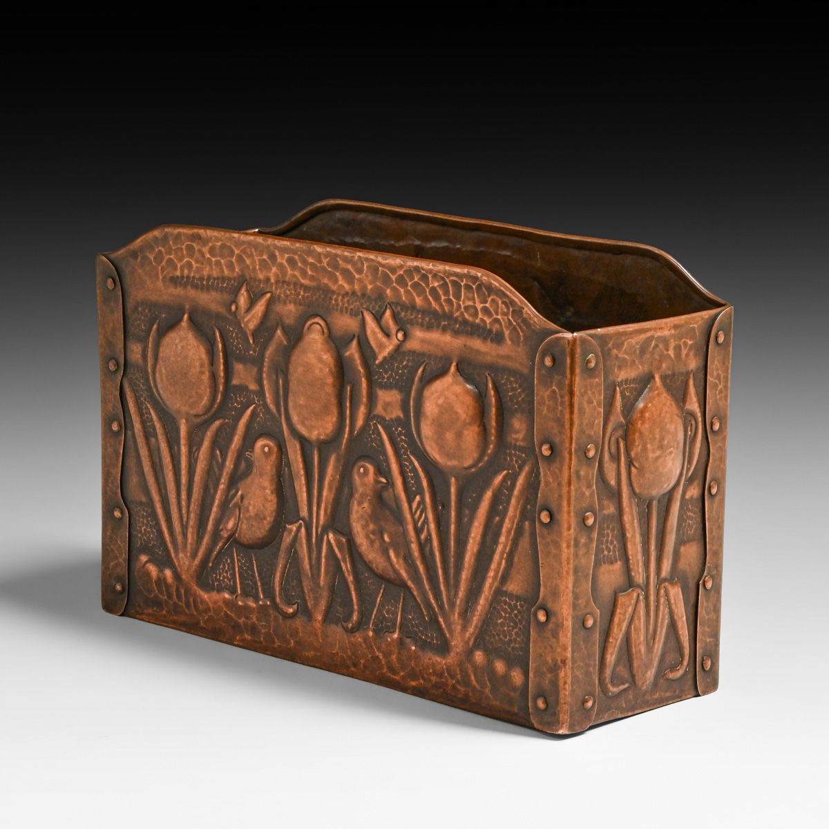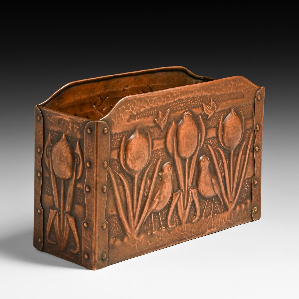 - John Pearson Guild of Handicraft Love Birds & Tulips Repousse Hammered Copper Letter Box c1888-1892