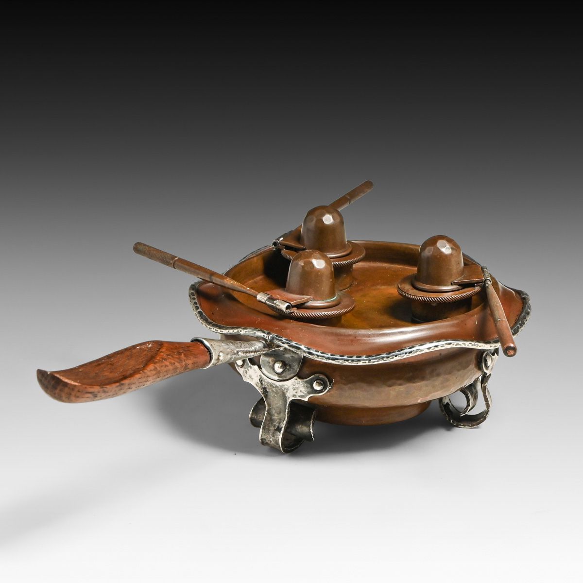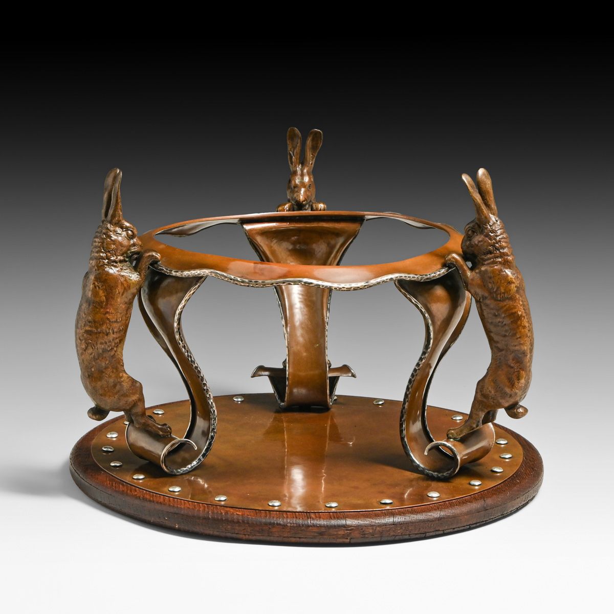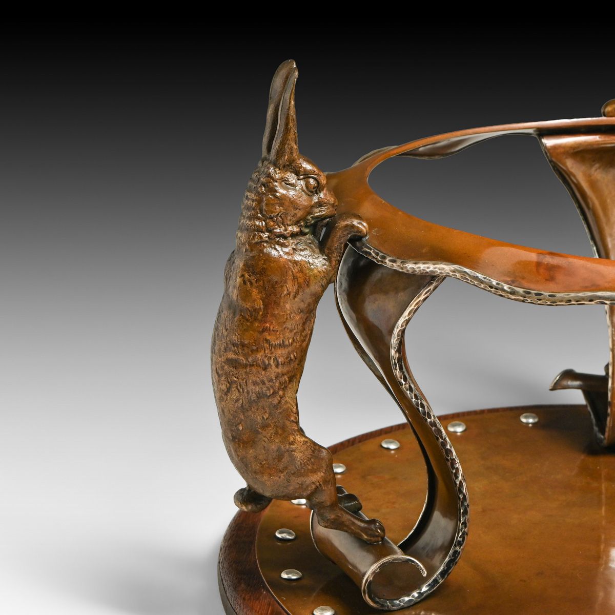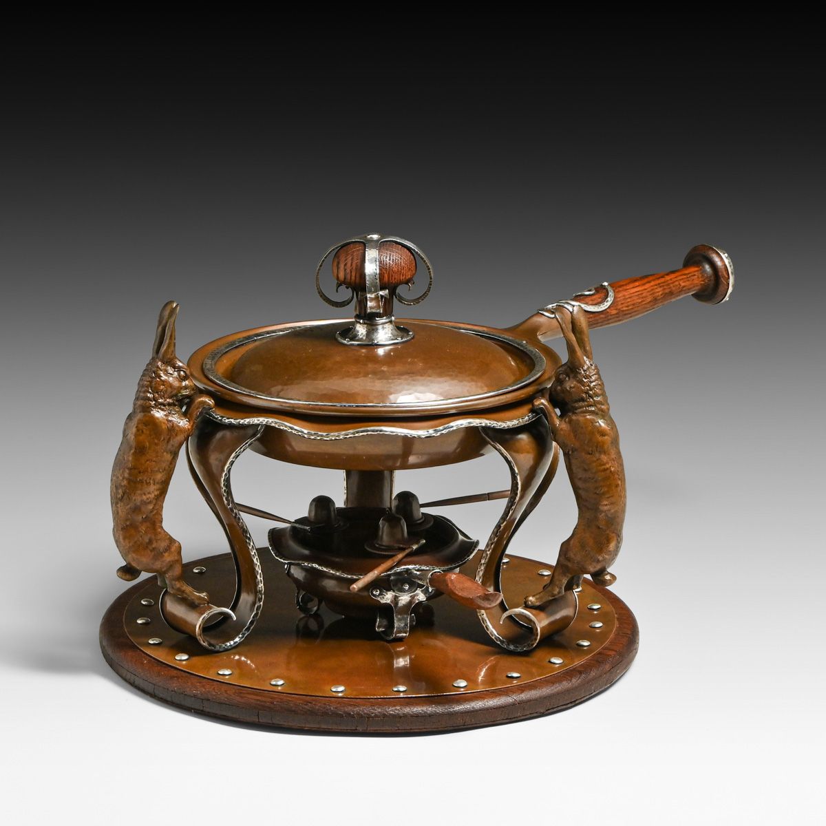- Joseph Heinrichs Hammered Copper & Silver Cutout Rabbit Chafing Dish c1910
