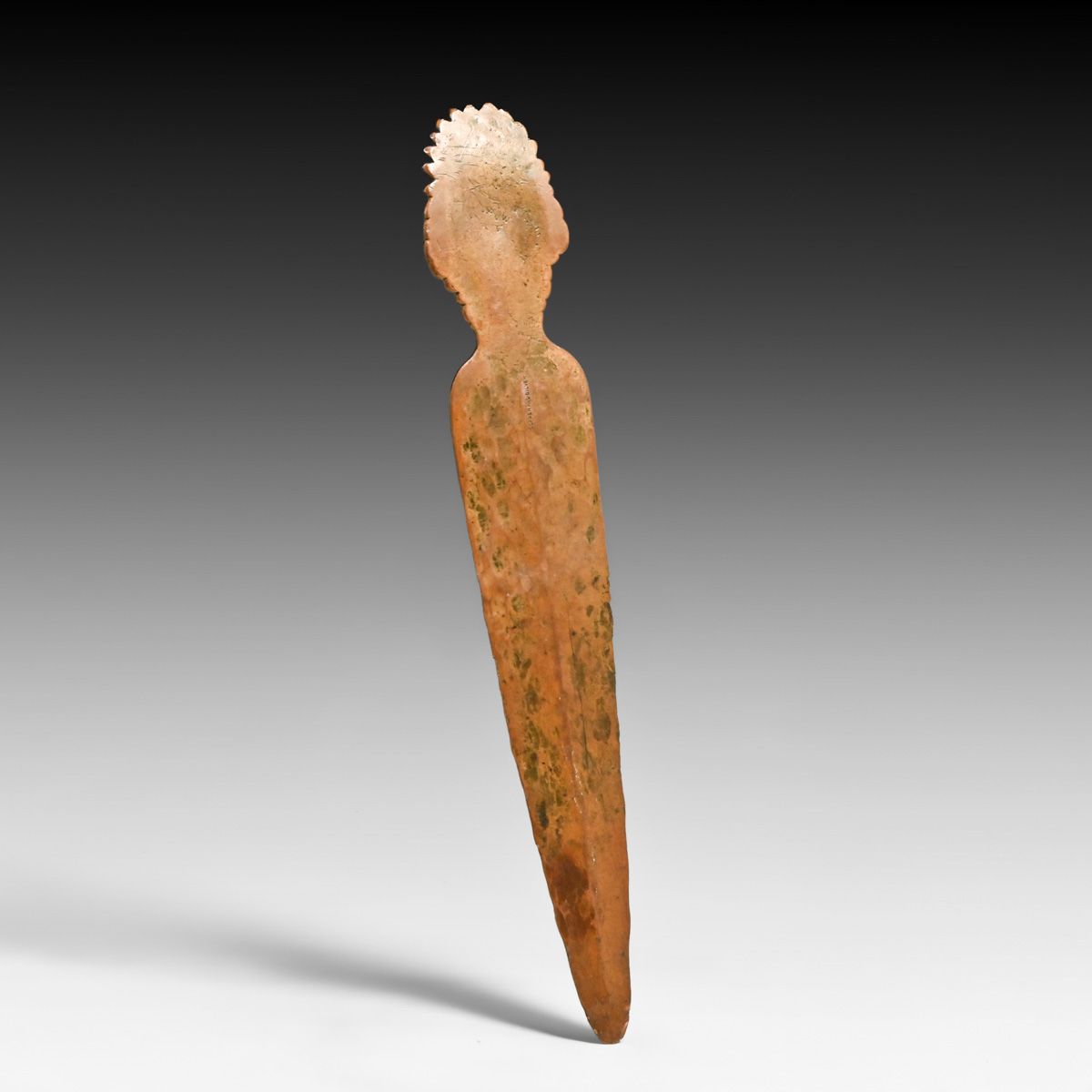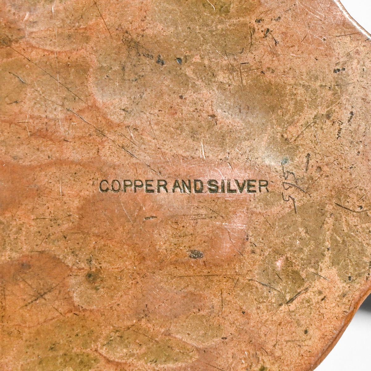 Joseph Heinrichs Native American Motif Sterling Silver & Copper Paper Knife c1905. Excellent original patina. One of the most impressive letter openers we have ever seen. Early Heinrichs pieces are marked either "Copper and Silver" or "Sterling and Other Metals". 11.5" long. Handle 3"h x 2"w