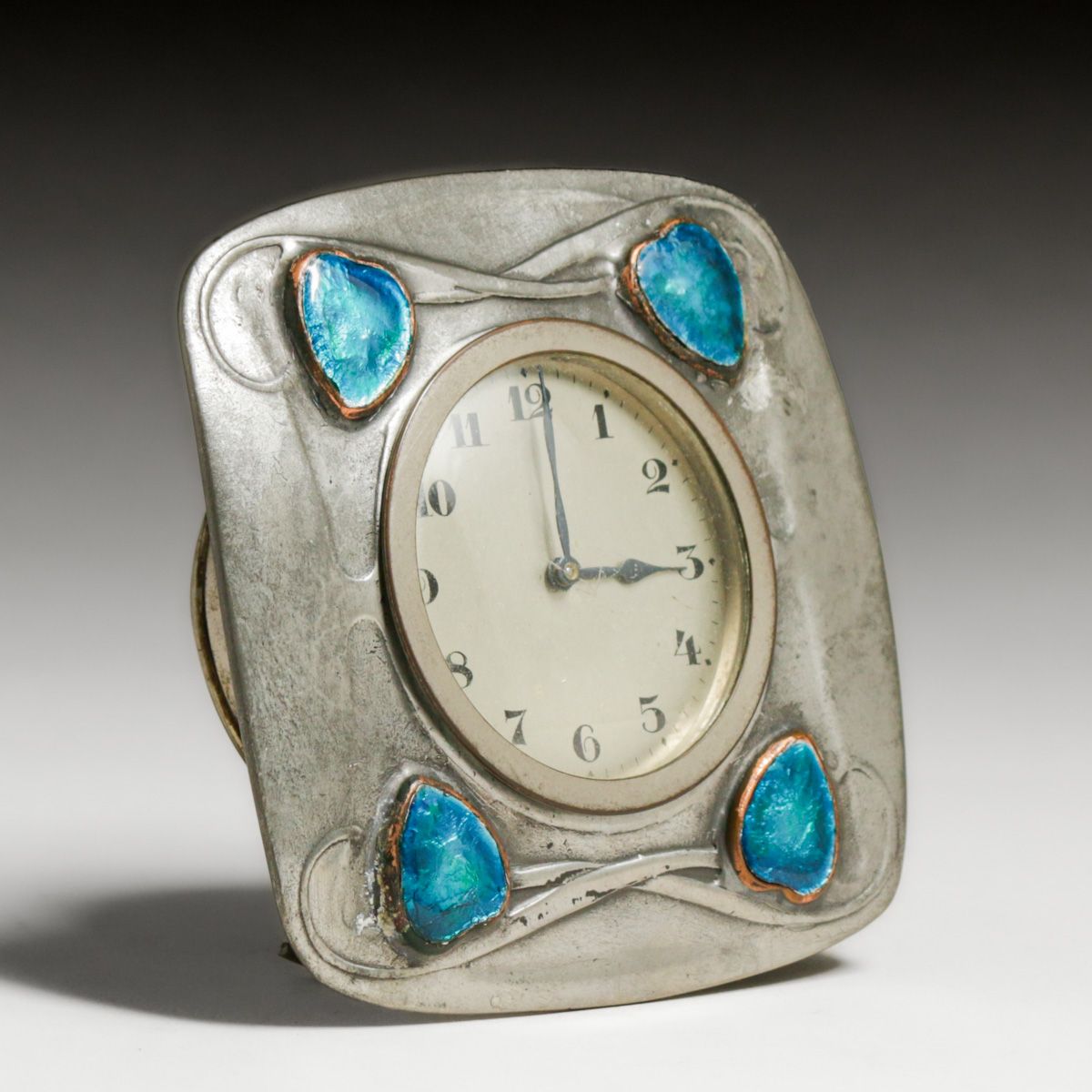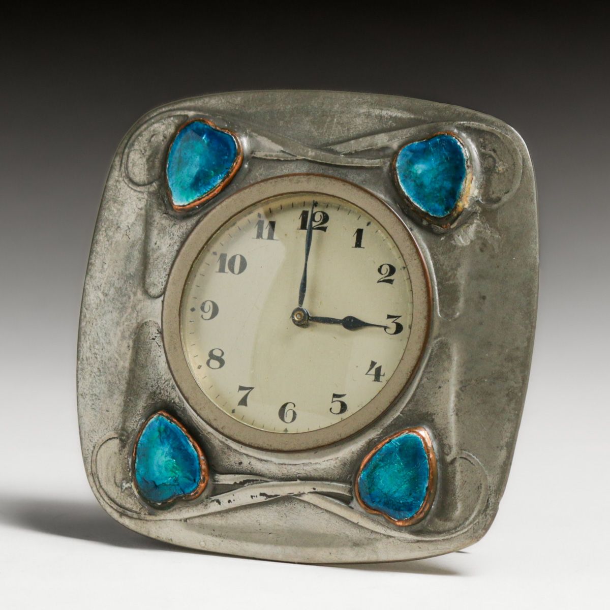 - Liberty & Co Archibald Knox Designed Pewter & Enamel Hearts Clock c1900