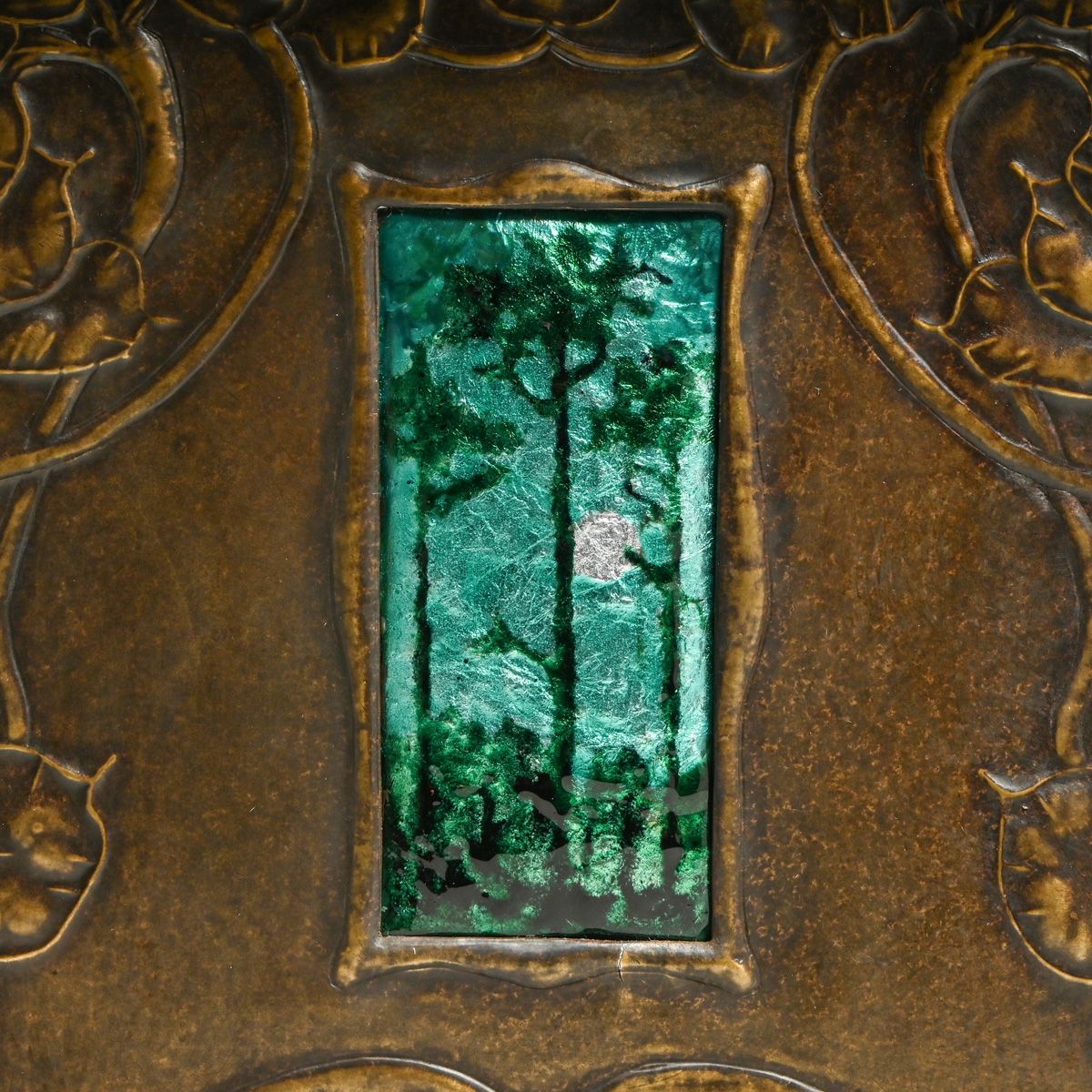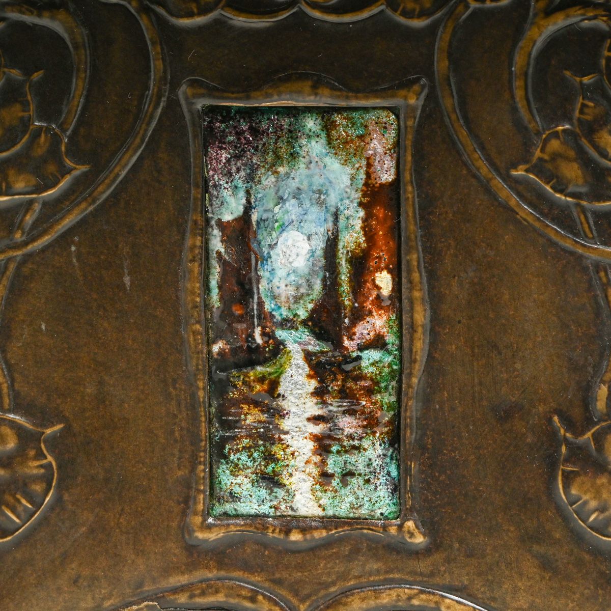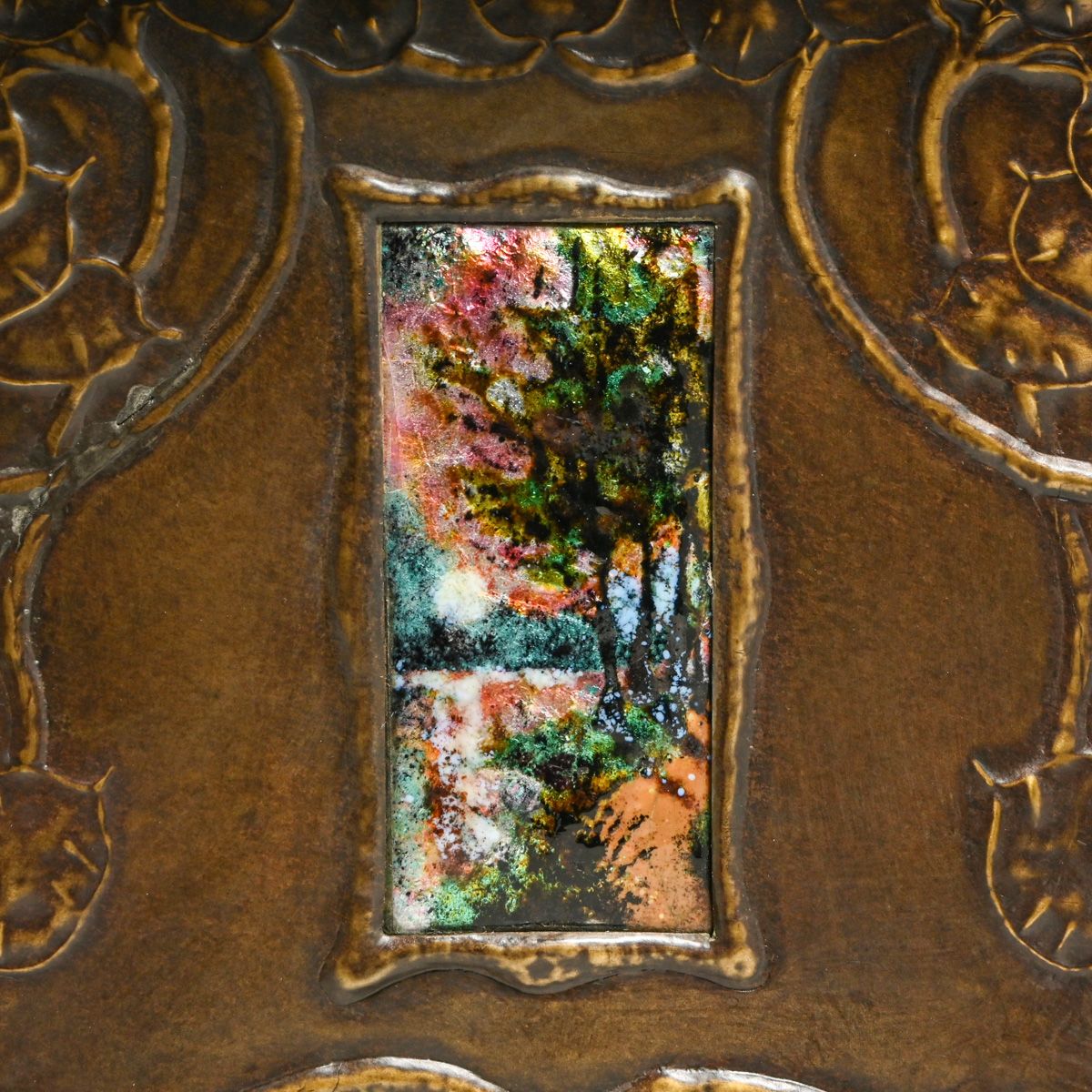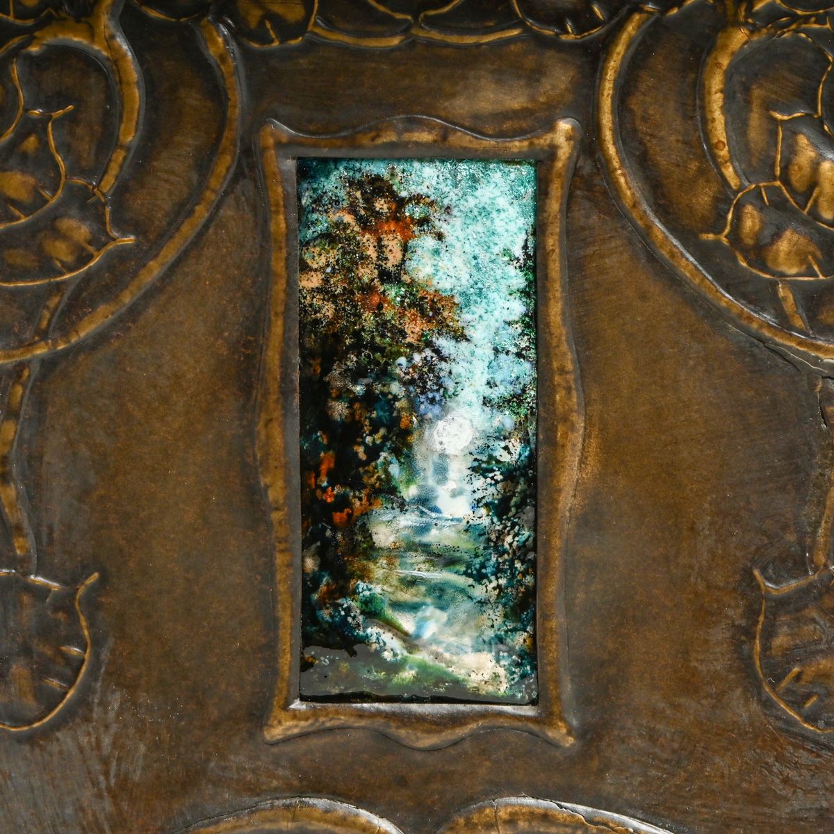Margaret Gilmour - Glasgow Hammered Copper & Enamel Square Jardiniere c1905. Unsigned. Excellent new patina. Original enamel panels in perfect condition. 10.25"h x 12.5" x 12.5"