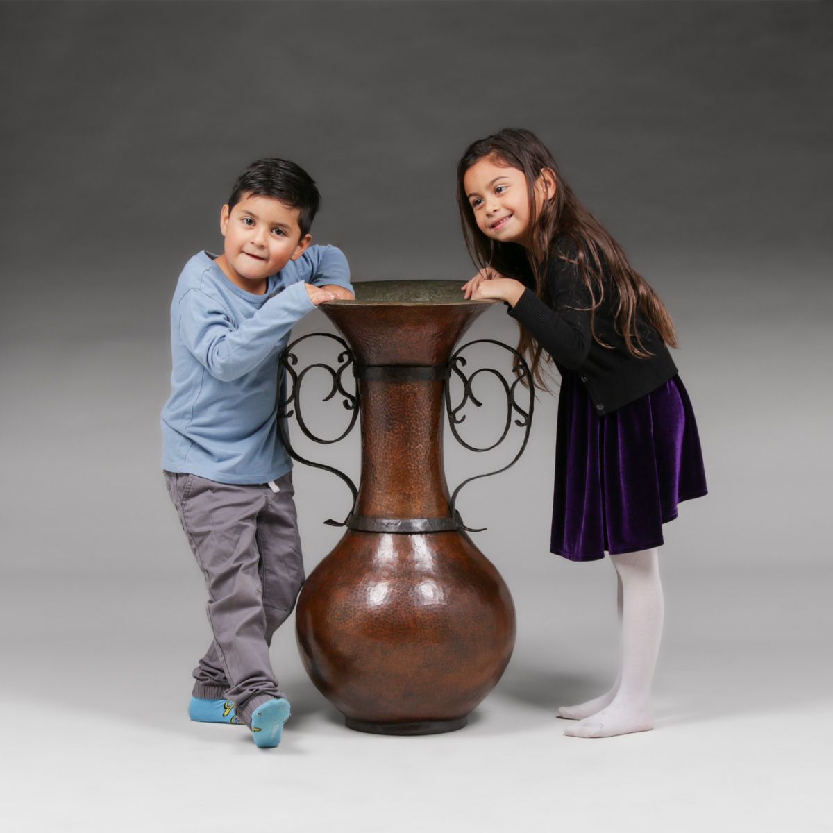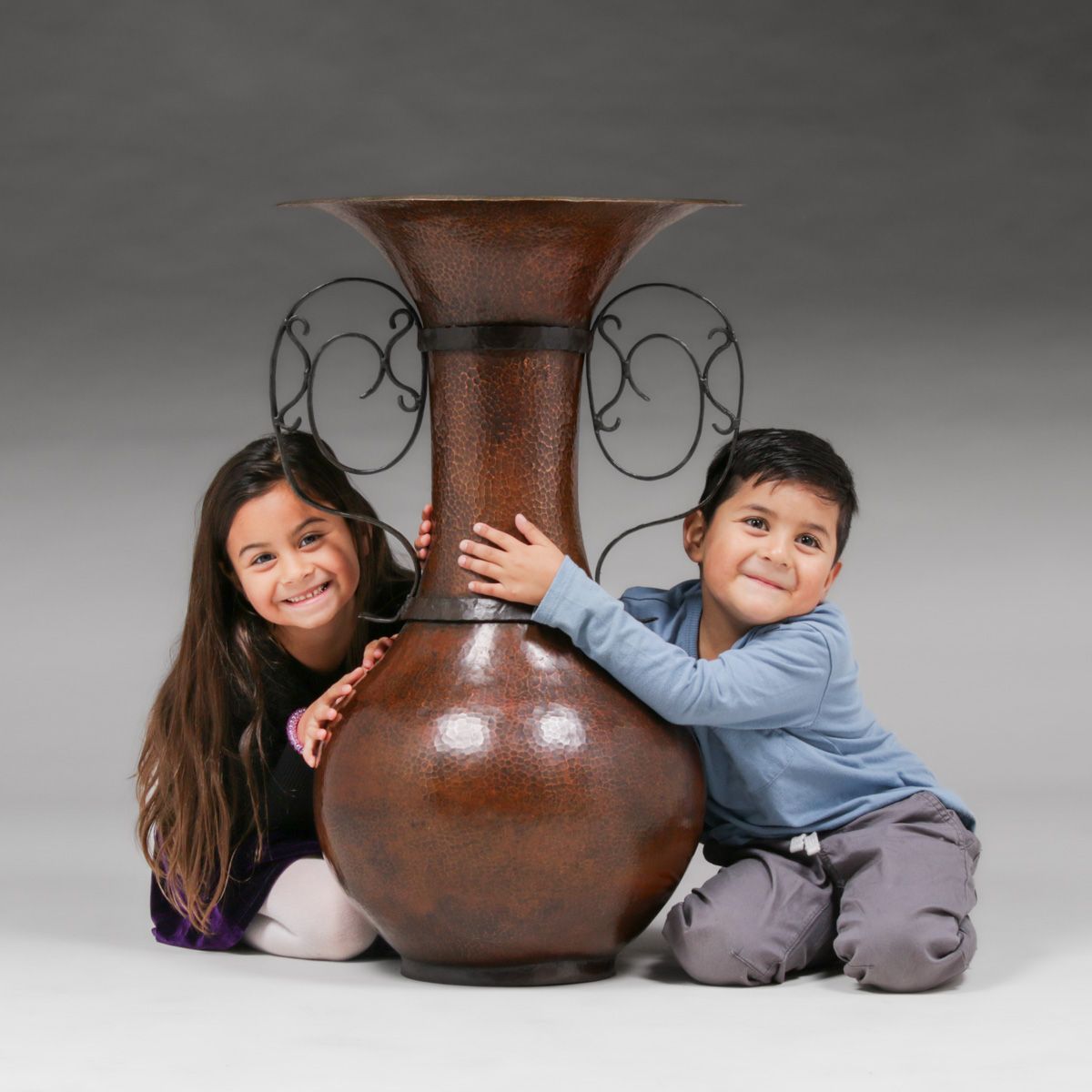 Huge Arts & Crafts Period Hammered Copper & Hand-Forged Iron Two-Handled Floor Vase c1910. Unsigned. Color added to excellent original patina. Children not included... 29.5"h x 18"d