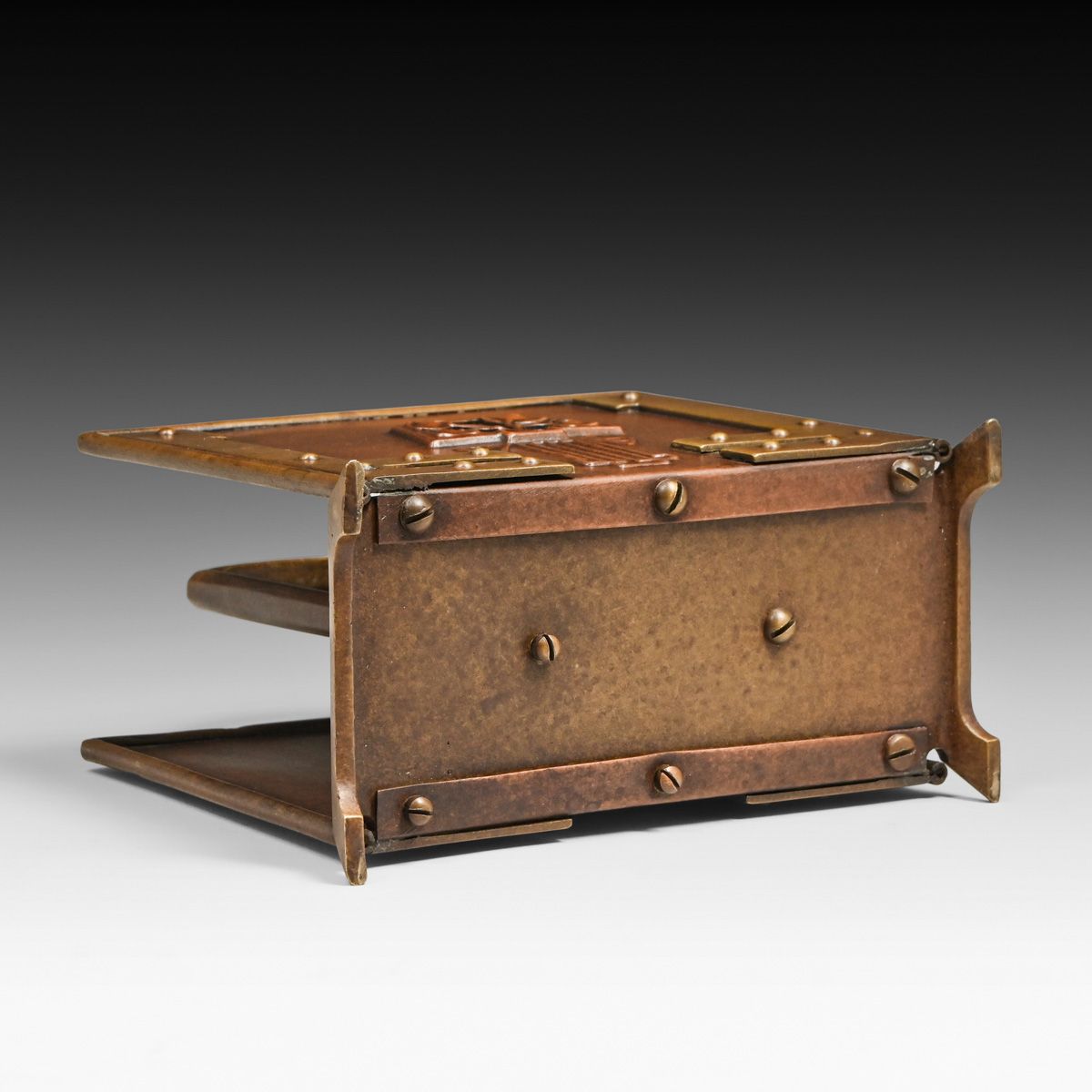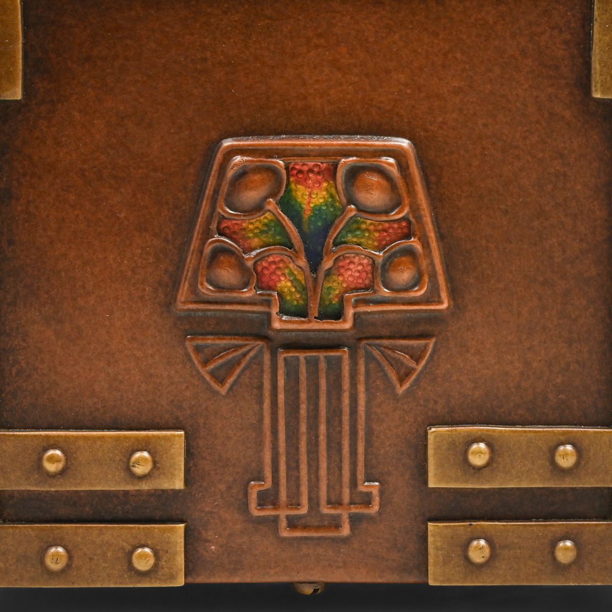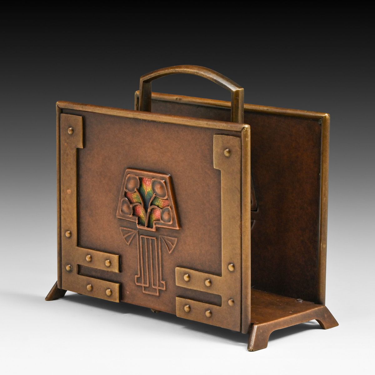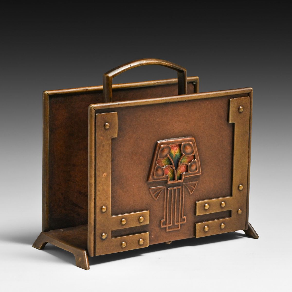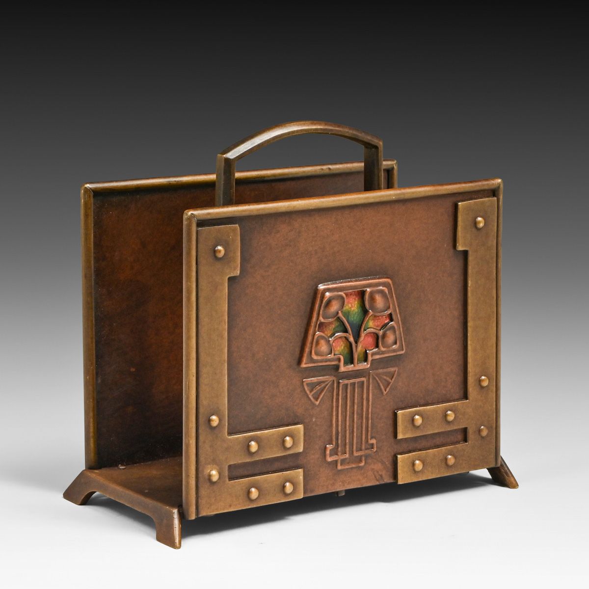Phoebe Anna Traquair (1852-1936) Glasgow Copper, Brass & Enamel Letter Rack c1905. Traquair was born in Ireland and graduated from the School of Design of the Royal Dublin Society. She married a Scot, moved to Edinburgh, and became an internationally known member of the Scottish Arts and Crafts movement. Unsigned. Excellent new patina. 5.5"w x 5"h x 2"