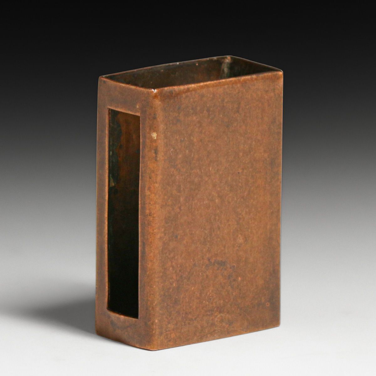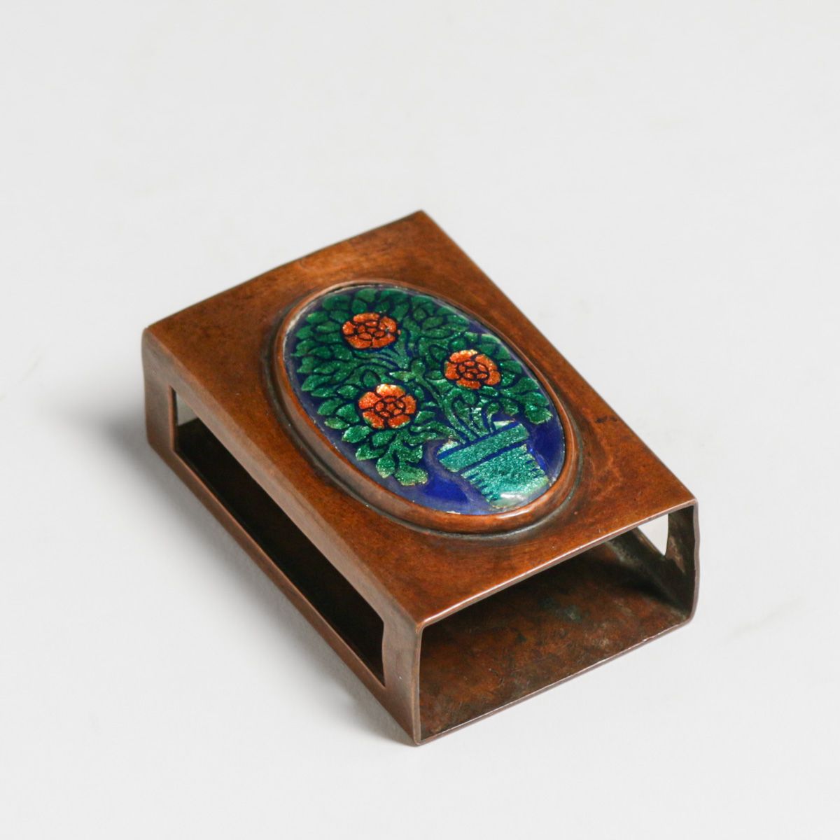 Rebecca Cauman Hammered Copper & Enamel Match Box Holder c1905. Unsigned. Excellent new patina. 2 3/8" x 1.5" x 7/8"