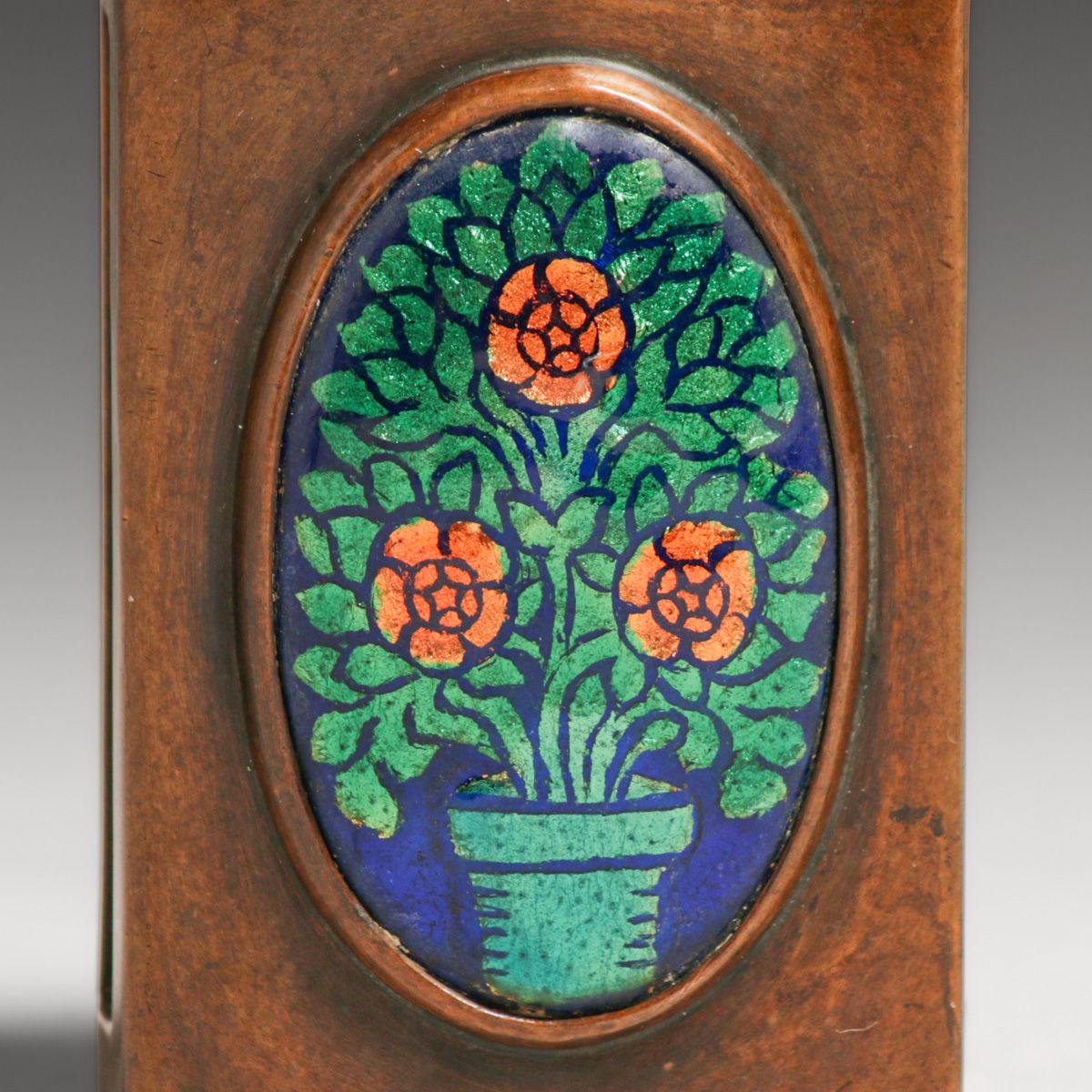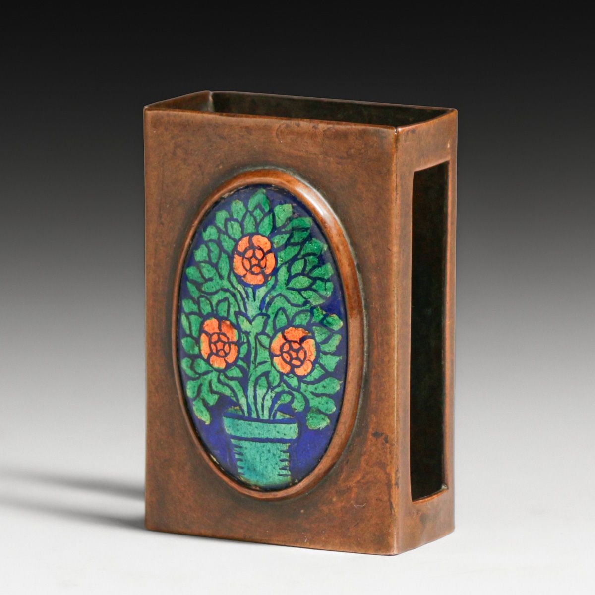 - Rebecca Cauman Hammered Copper & Enamel Match Box Holder c1905