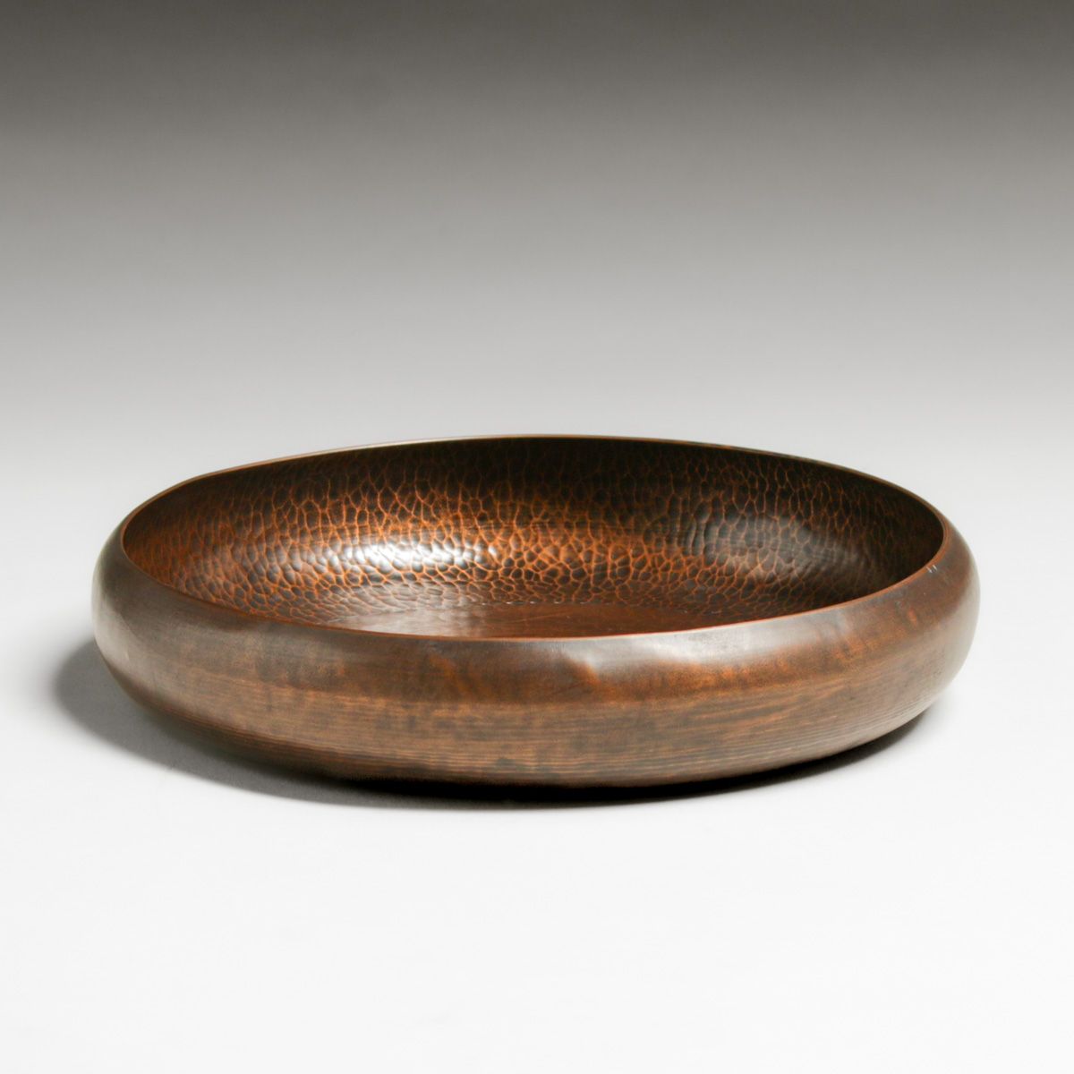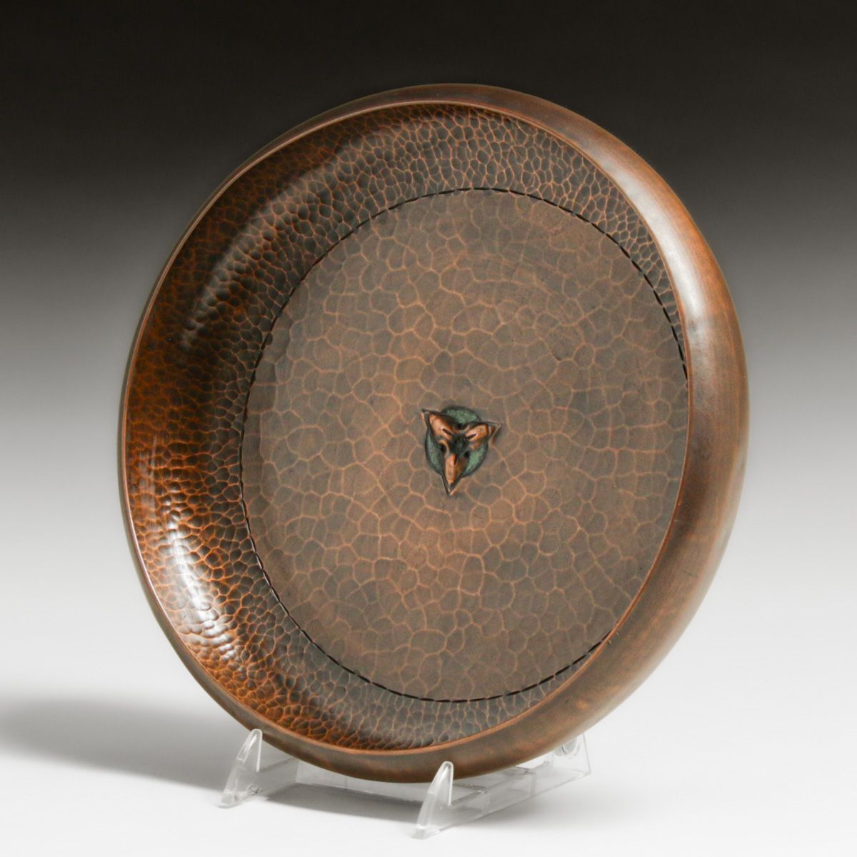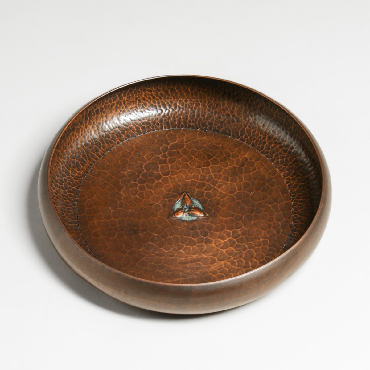 Roycroft Hammered Copper Trefoil Bowl c1915. Signed with earlier mark. Excellent new patina. 8.25"d x 1 5/8"h.