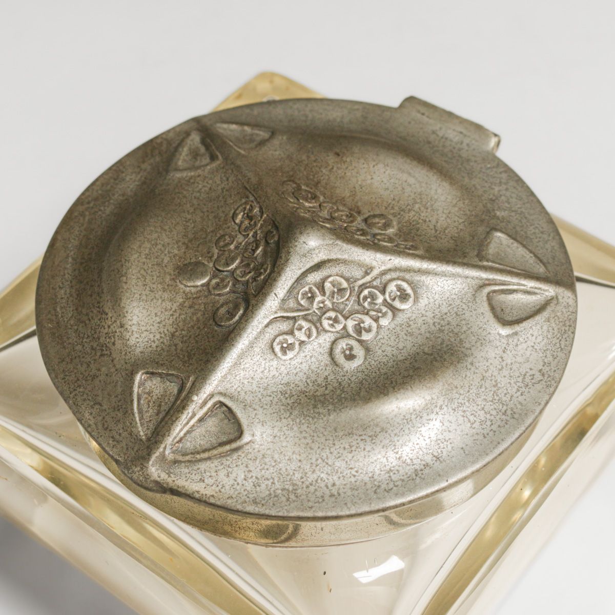 William Hutton & Sons Ltd - Sheffield, England Art Nouveau Pewter & Glass Inkwell c1900s. Signed. Excellent original patina. 4.5" x 4.5" x 3.25"h