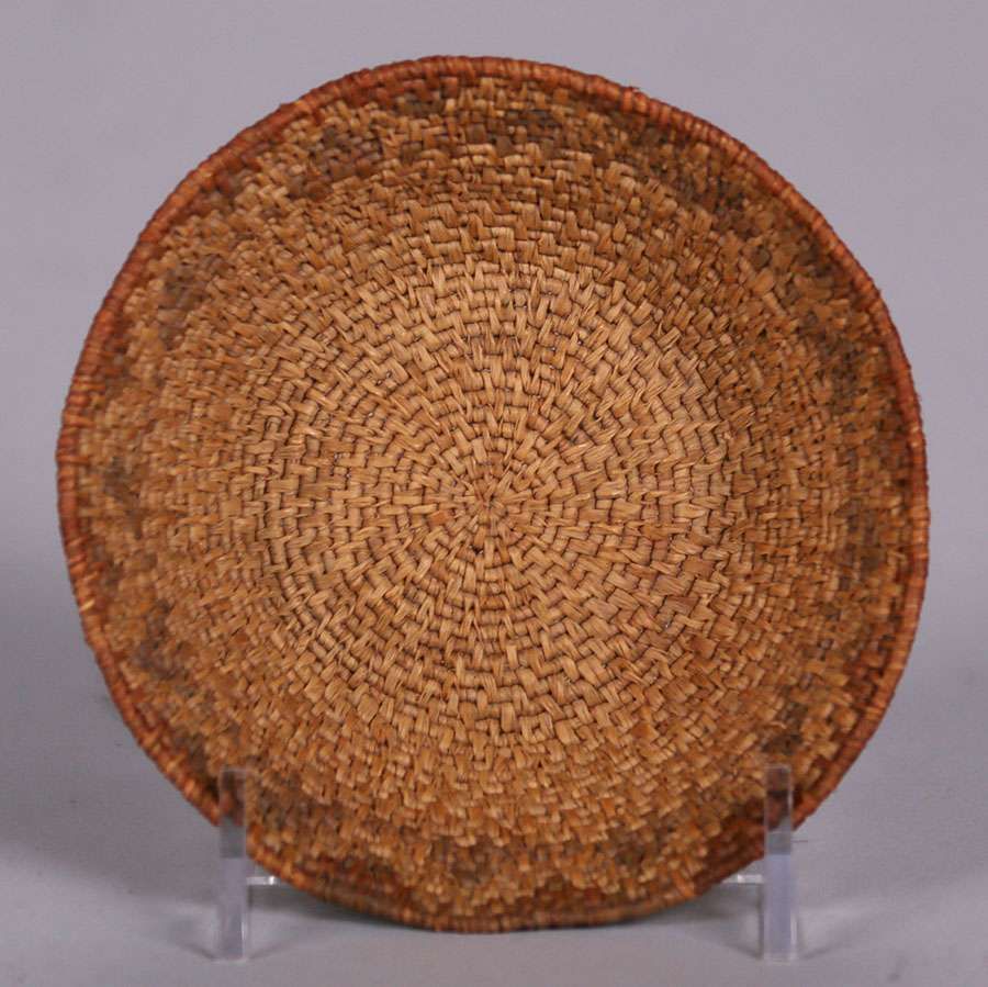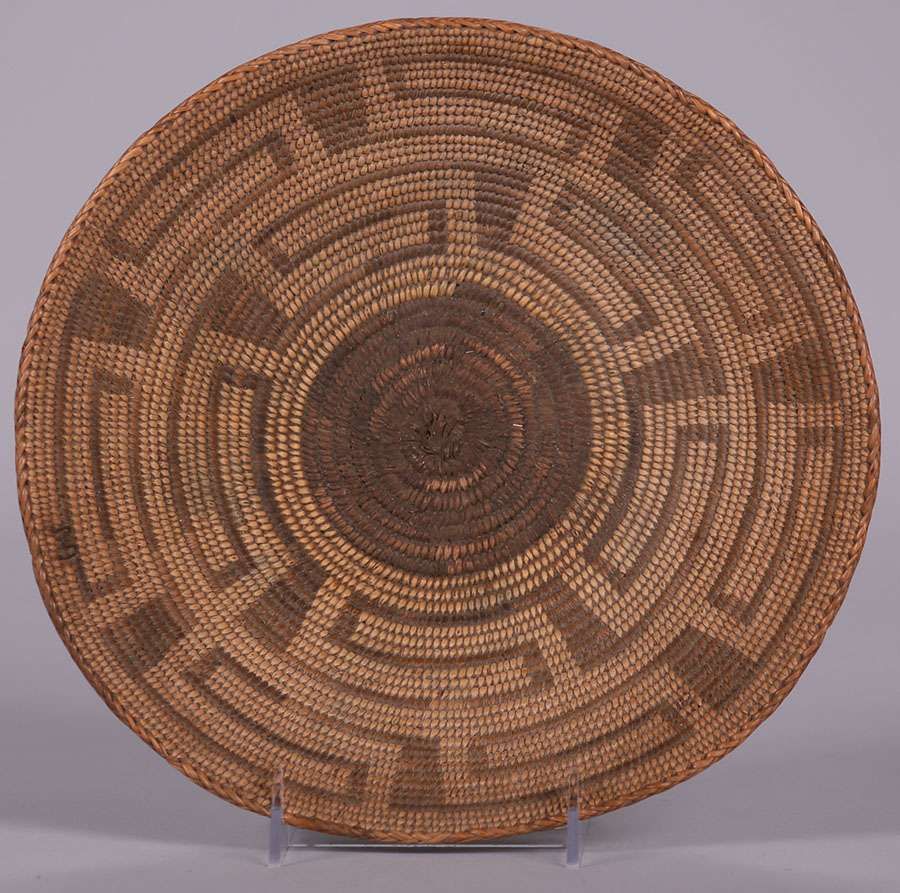 Native American baskets – Pima, Apache & Papago Tribes – Arizona – early 20th century. Pima raised basket 9.5"d x 4"h SOLD ; Apache basket 10.5"d x 3.5"h SOLD ; small Pima basket 4.5"d SOLD ; Papago basket with flying birds (some fraying to base) 9"h x 8"d SOLD