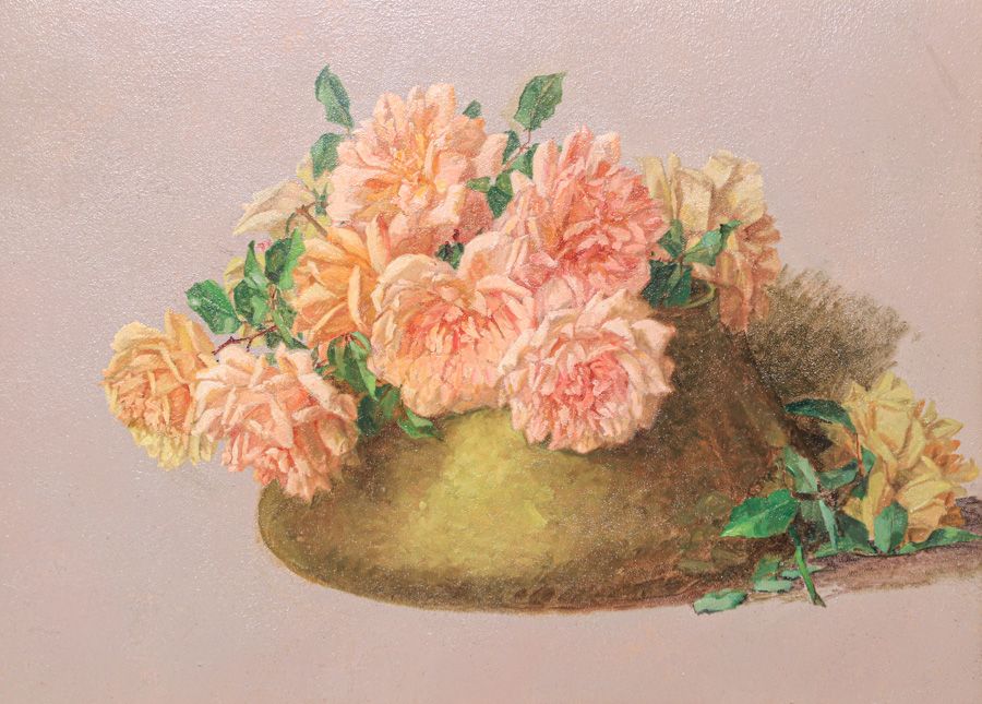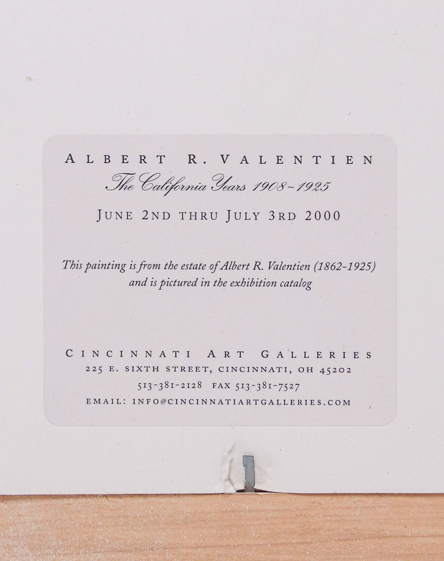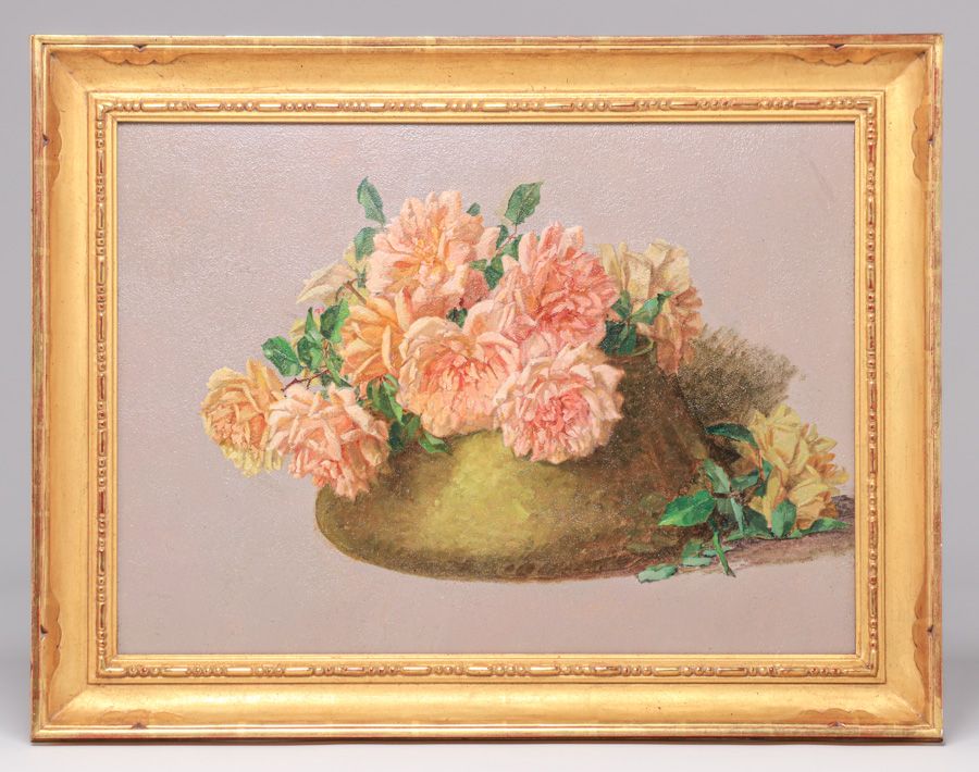 Albert R. Valentien (1862-1925) Painting "Gathered Roses and Copper Bowl" after 1908. Oil painting on board. Unsigned. Excellent condition. Exhibited "Albert R. Valentien The California Years 1908-1925" Cincinnati Art Galleries June 2nd thru July 3rd, 2000. 19"h x 26"w. Frame 24 3/8"h x 31.5"w SOLD