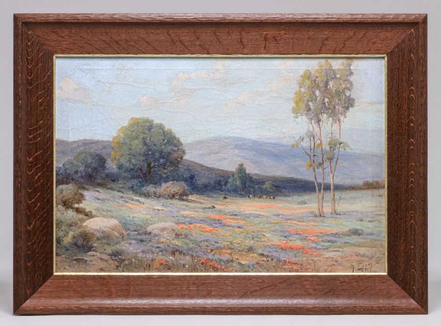 Angel Espoy (1879-1963) California Eucalyptus, Poppies & Lupine Painting c1910s. Signed. Excellent condition. Tim Holton custom carved oak frame. 20"h x 30"w. Frame 26.75"h x 36.5"w SOLD