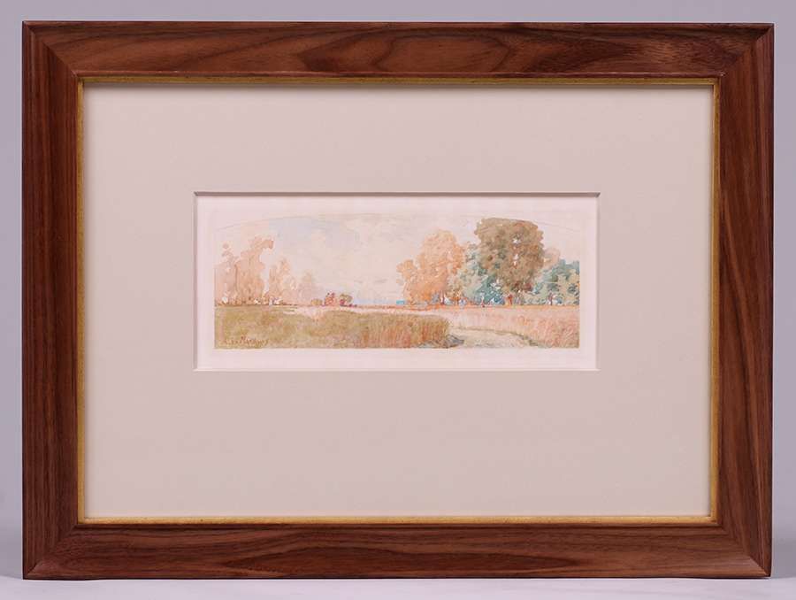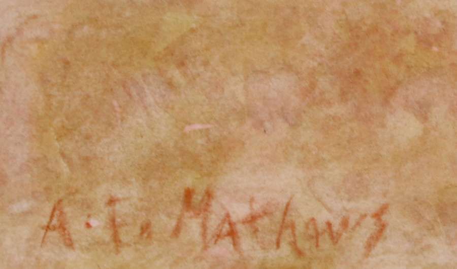 Arthur F. Mathews (1860-1945) watercolor study of river and tree c1890s. Signed "A.F. Mathews". Slightly faded, otherwise excellent condition. Tim Holton custom frame with UV filtered museum glass. 3 5/8"h x 9 7/8"w. Holton frame 15"h x 20.25"w SOLD
