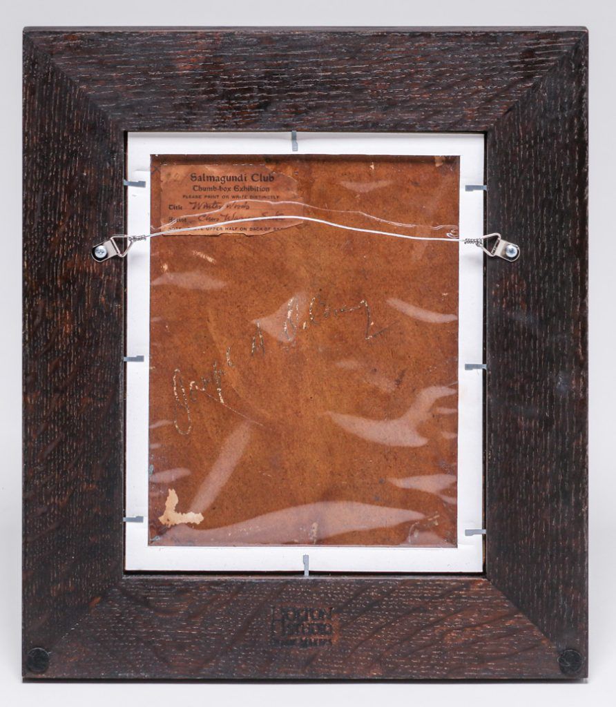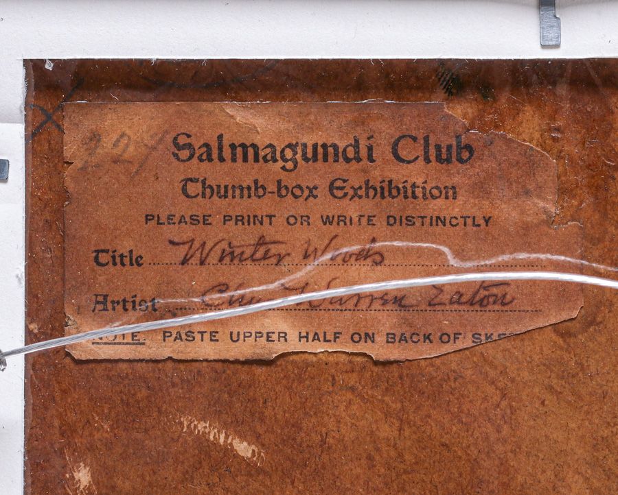 Charles Warren Eaton (1857-1937) Painting “Winter Woods" c1910. Exhibited Salmagundi Club. Signed. Excellent condition. Tim Holton custom hand-carved oak frame. 10"h x 8"w. Frame 15"h x 13"w SOLD