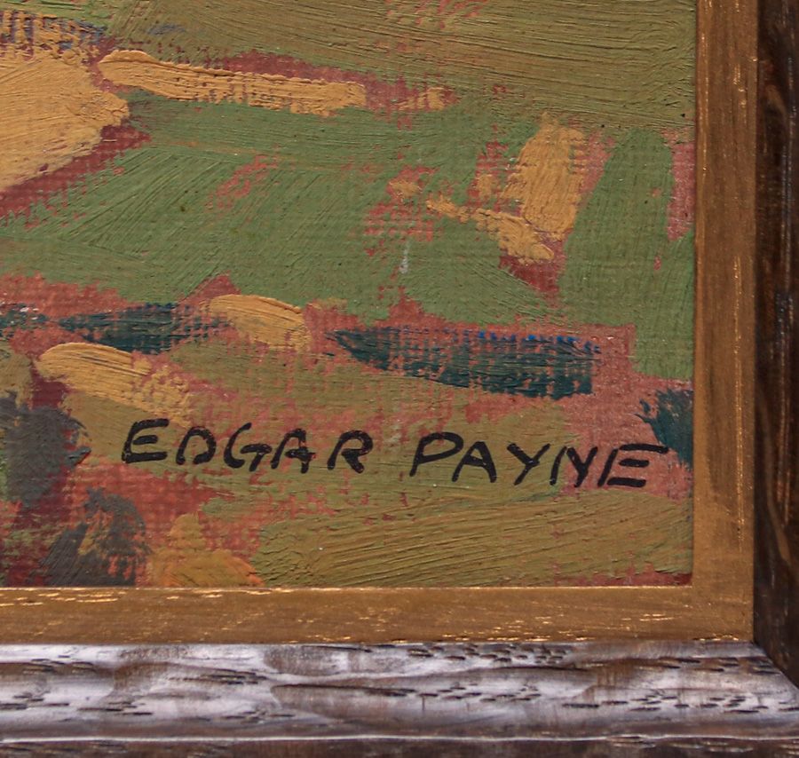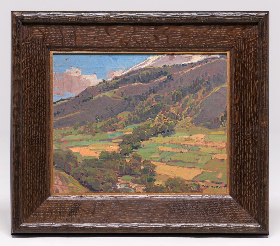 Edgar Payne (1883-1947) Painting "Near St. Gervais - France" c1922-1924. Oil painting on masonite. Edgar Payne traveled with his wife Elsie for a two year painting tour of Europe 1922-1924. Signed. Excellent condition. Tim Holton hand-carved custom oak frame. 13"h x 16". Frame 19 5/8"h x 22.5"w SOLD