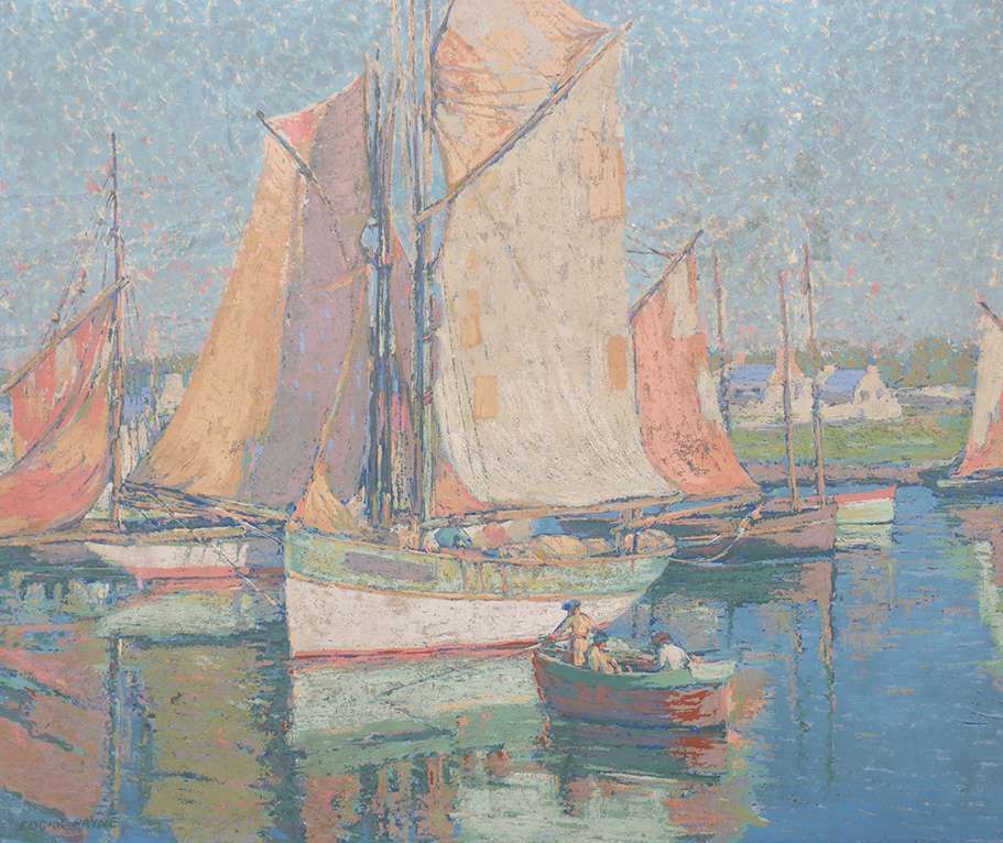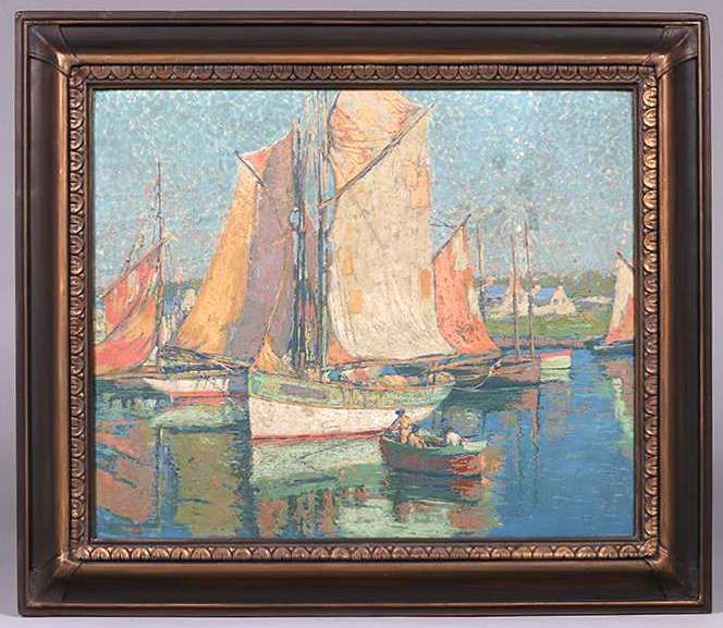 Edgar Payne (1883-1947) serigraph of Sailboats c1915. Serigraph prints of his work were produced and authorized by Edgar Payne to allow access to his work by many at a much lower cost. Because of the raised serigraph pigment, many people confuse these with original oil paintings by Edgar Payne. Signed. 20"h x 24"w. Original frame 27"h x 30.5"w SOLD