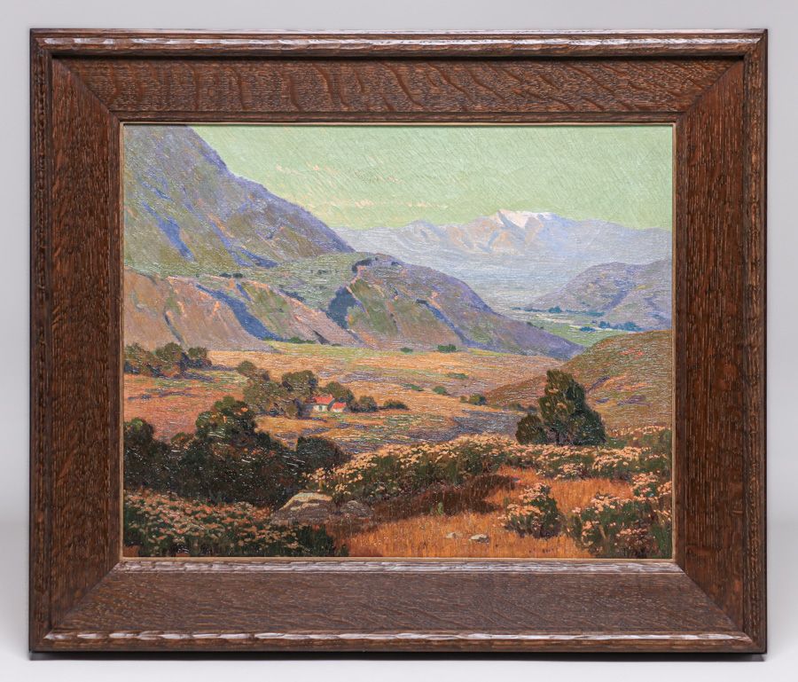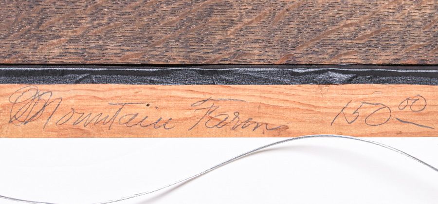 Elmer Wachtel (1864-1929) California Painting "Mountain Farm" 1910. Oil painting on canvas. Recently acquired from Gold Hill, Oregon Estate where the painting has resided for the past 100+ years. Signed. Excellent condition. Tim Holton hand-carved oak frame. 16"h x 20"w. Holton frame 22 1/8"h x 26 1/8"w SOLD