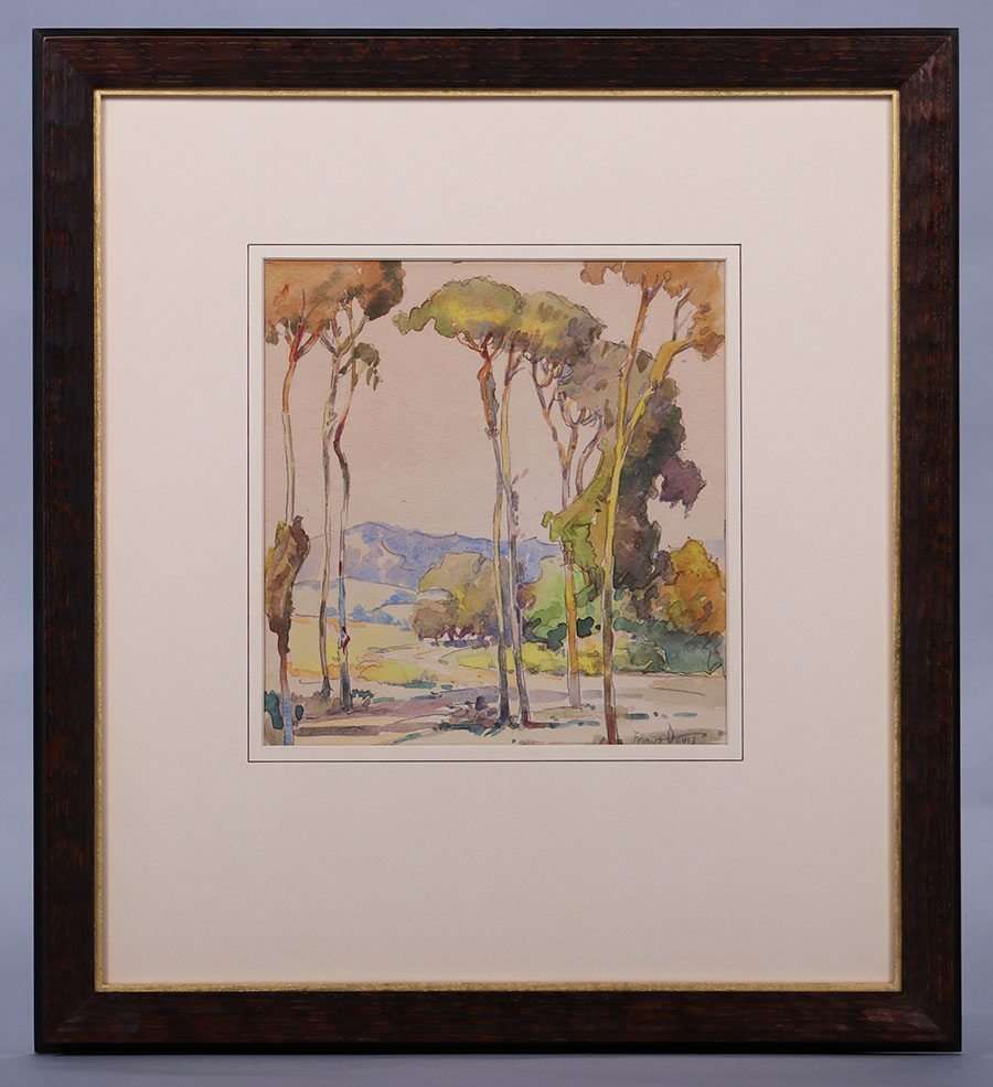 Francis Davis Schwartz (1879-1969) Watercolor Eucalyptus Trees & Mt Tamalpais c1920s. Image 9″h x 8.5 “w. Tim Holton custom hand-carved oak frame 18.25″h x 16.75"w SOLD