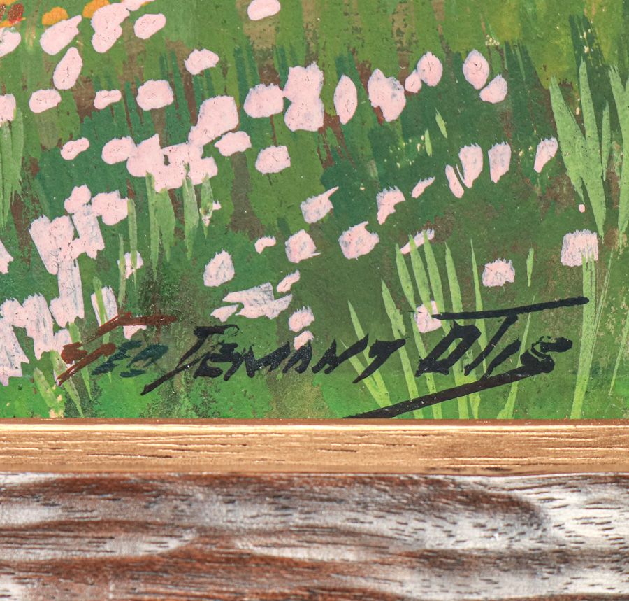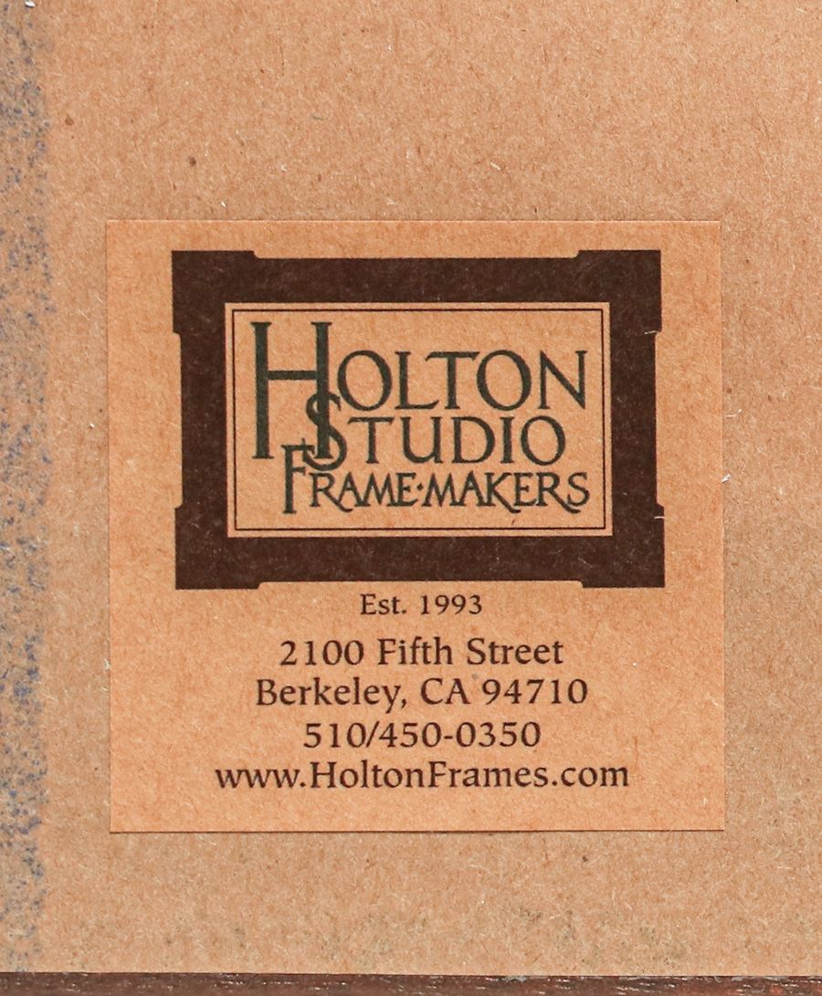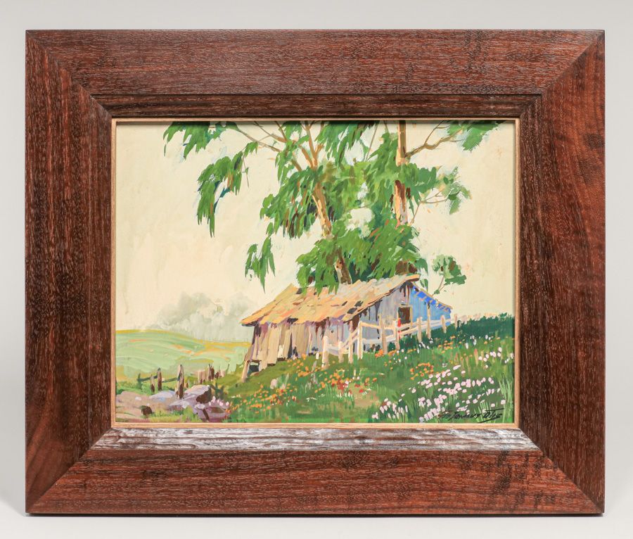 George Demont Otis (1879-1962) California Eucalyptus & Barn c1920. Oil painting on panel. Signed. Excellent condition. Tim Holton hand carved walnut frame. 9"h x 12"w. Frame 13 7/8"h x 16 5/8"w $3500