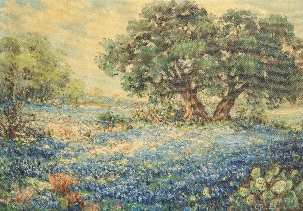 - Grace Dermody (1889-1963) Texas Bluebonnet & Oak Tree Painting c1920