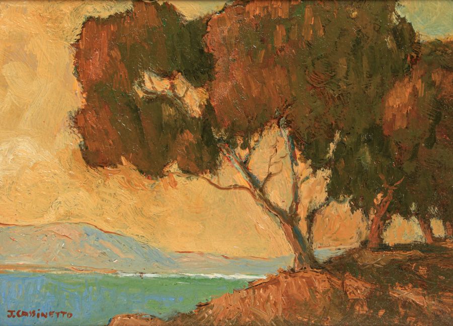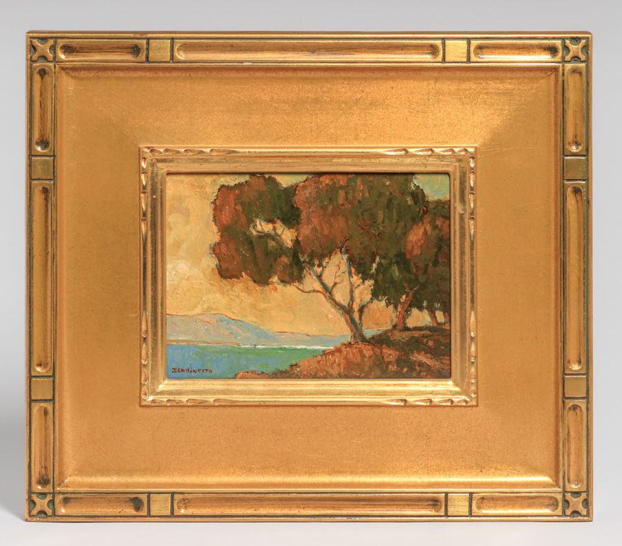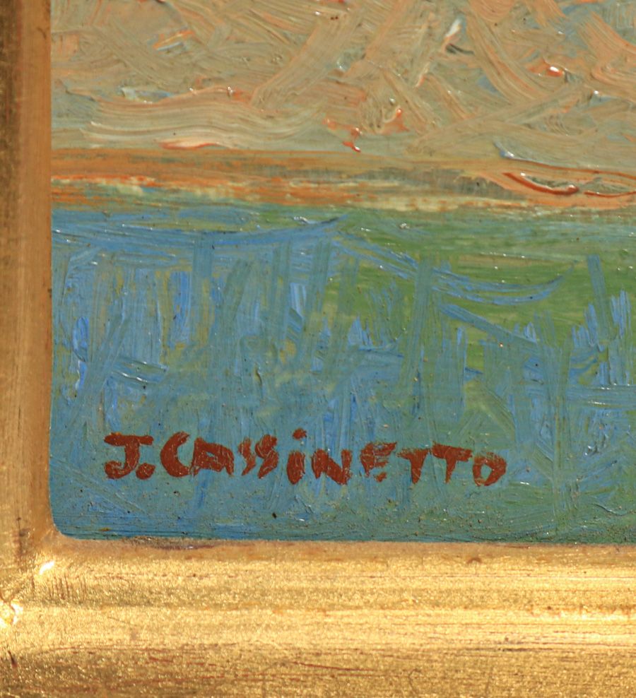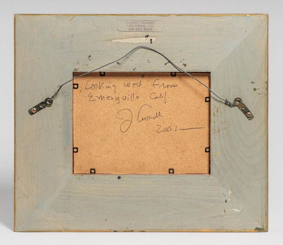 Jack Cassinetto (1944-2018) California Painting “Looking West from Emeryville, Calif” 2002. Excellent condition. Signed. 6"h x 8.25"w. Frame 13 1/8"h x 15 1/8"w SOLD