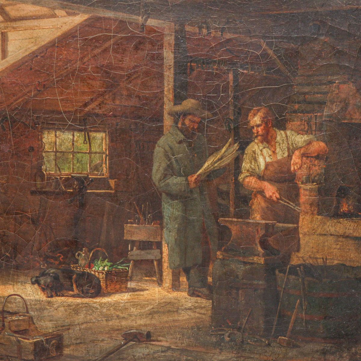John Henry Dolph (1833-1903) "The Blacksmith" Painting 1870. Signed. Heavy craqueleur, otherwise excellent condition. OD: 19"h x 23"w ID: 13.75"h x 17.5"w