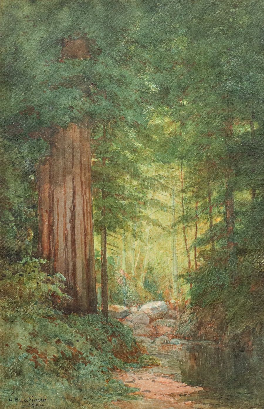 - Lorenzo Latimer (1857-1941) Watercolor Stream Through the Redwoods 1904