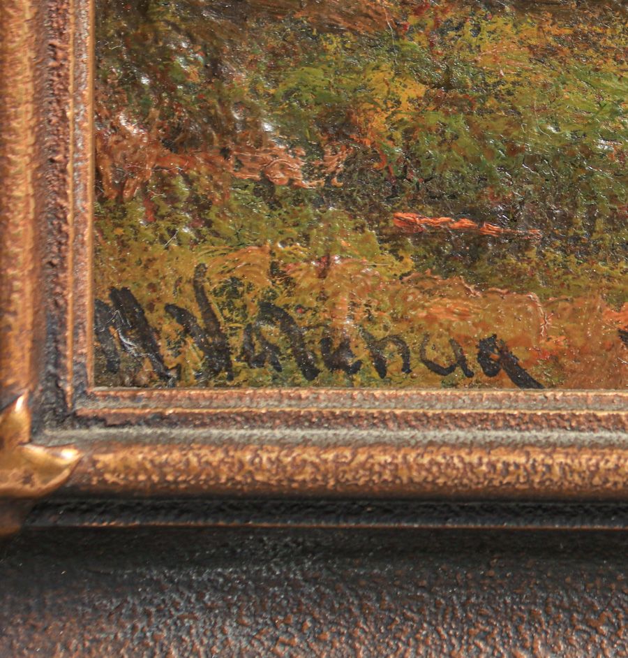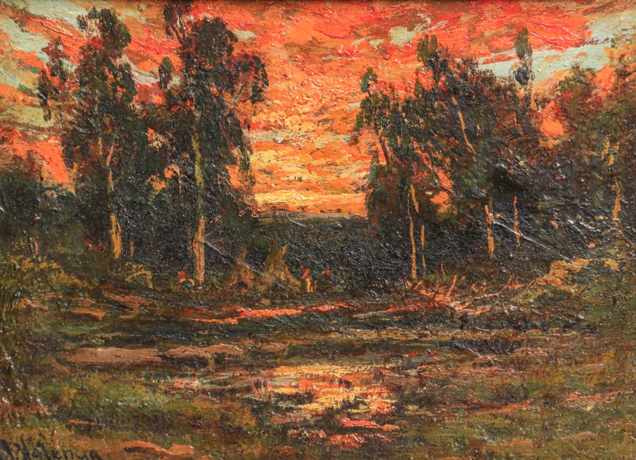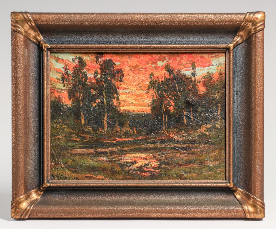 Manuel Valencia (1856-1935) California Sunset Eucalyptus Oil Painting c1910. Signed. Excellent condition. 9"h x 12"w. Frame 13.5"h x 16.5"w SOLD