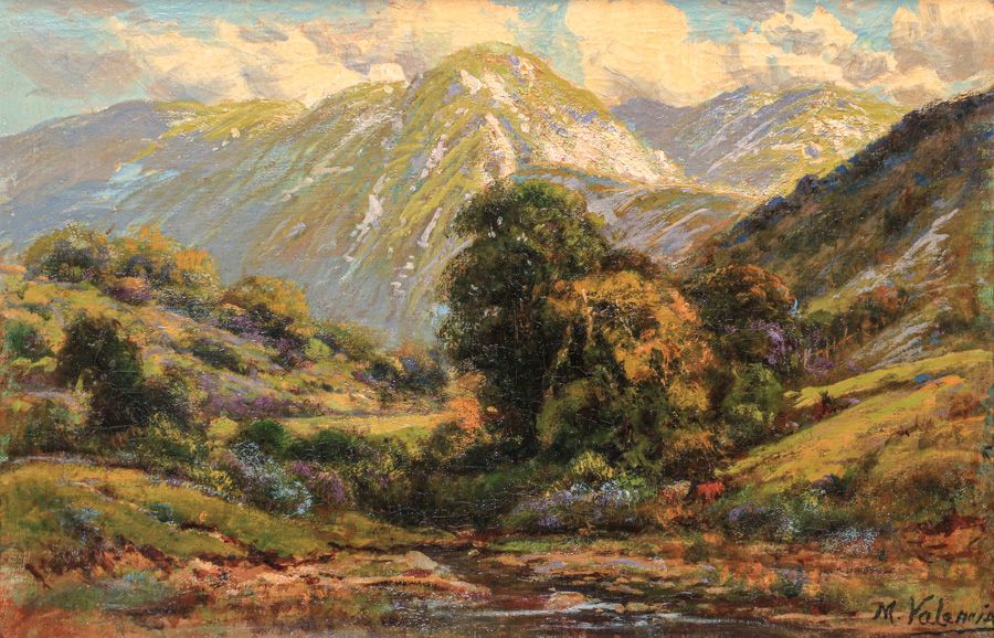 Manuel Valencia (1856-1935) Sierra Mountains Painting c1910. Oil painting on canvas. Signed. Excellent condition. Tim Holton custom oak frame. 20"h x 30"w. Frame 27.25"h x 36"w SOLD