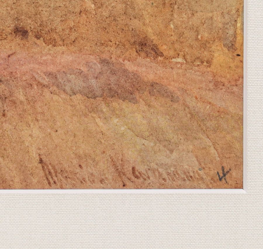 Marion Kavanaugh Wachtel (1876-1954) California Ranch Mountain Watercolor 1904. Signed "Marion Kavanaugh 4". She married Elmer Wachtel July 30, 1904, so this painting was painted the first half of 1904. Excellent condition. Image 10.25"h x 14"w. Frame 22.25"h x 26.25"w SOLD