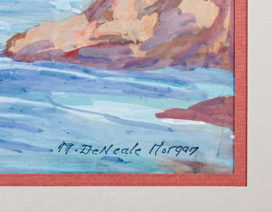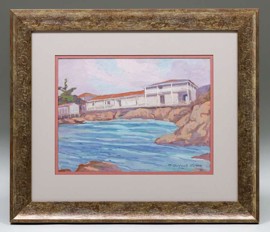 Mary de Neale Morgan (1868-1948) Old Custom's House, Monterey, CA Gouache Painting c1920. Signed lower right and estate signed on reverse. Excellent condition. 9.5"h x 12.5"w. Frame 17.5"h x 20.75"w SOLD