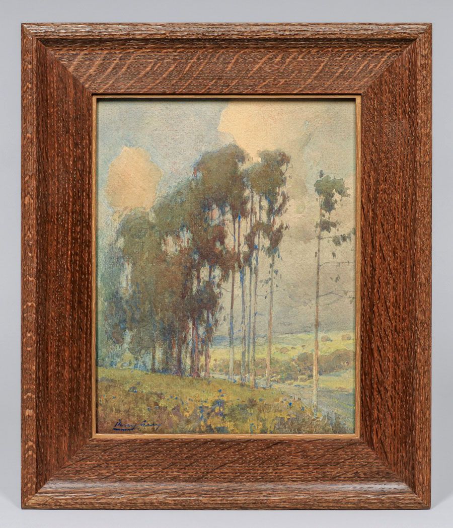 Percy Gray (1869-1952) Watercolor California Eucalyptus 1915. Enscribed on back "To my friend Esther, Percy Gray ... 20th, 1915". Signed. Excellent condition. Tim Holton custom hand-carved oak frame. 9.5"h x 7.25"w. Frame 13.75"h x 11.5"w SOLD