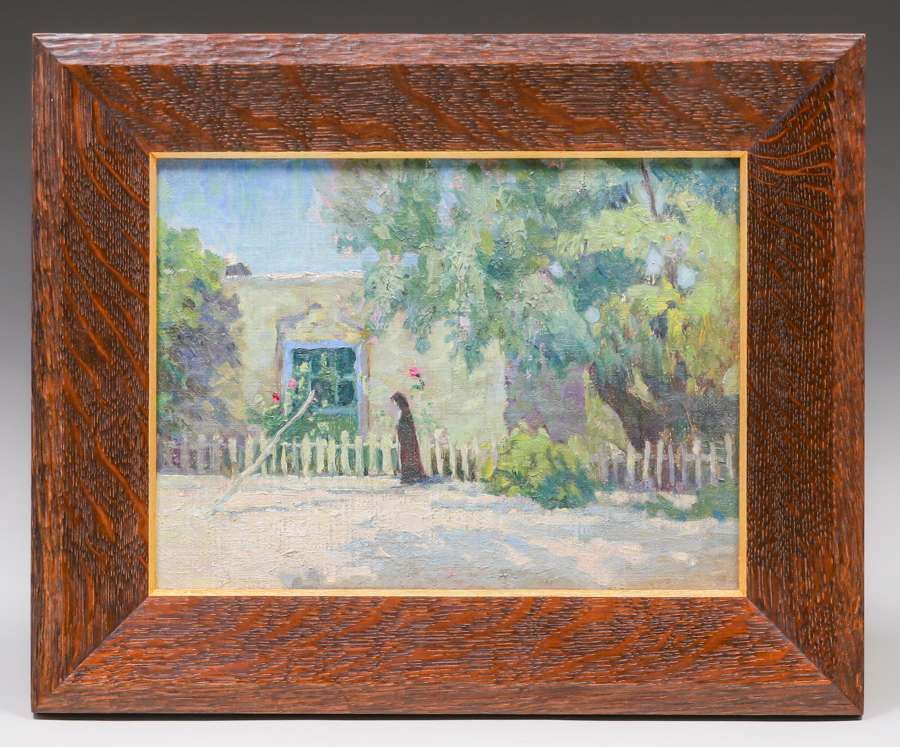 Will Sparks (1862 – 1937) Painting Spanish Adobe c1910s. Unsigned. Excellent condition. 9″h x 12″w. Tim Holton custom oak frame 13.25″h x 16.25″w SOLD