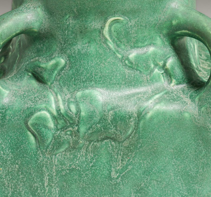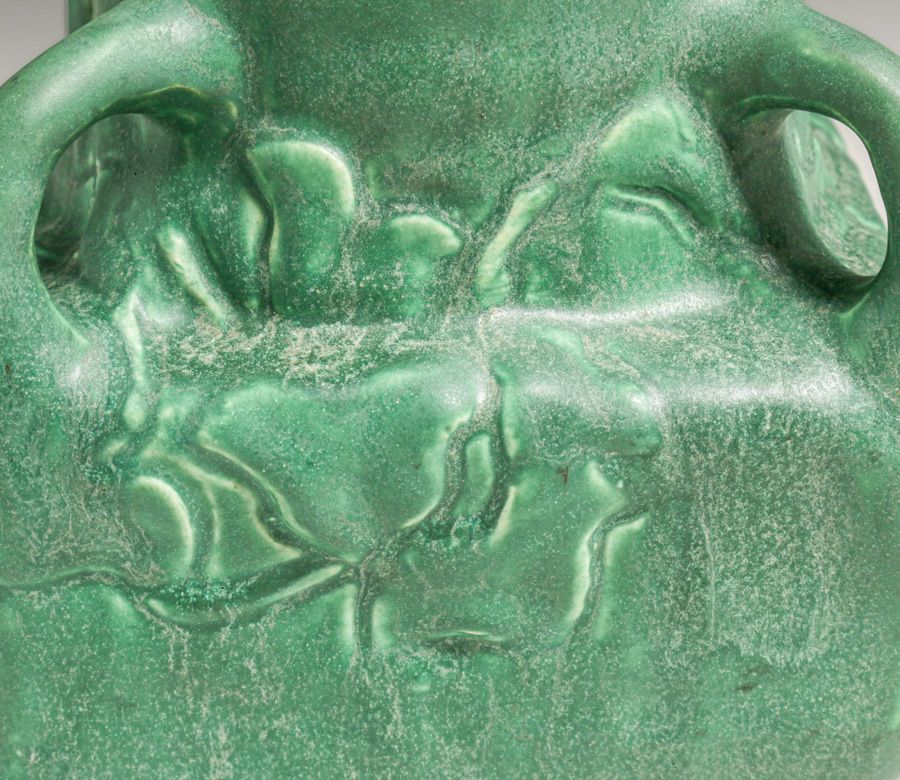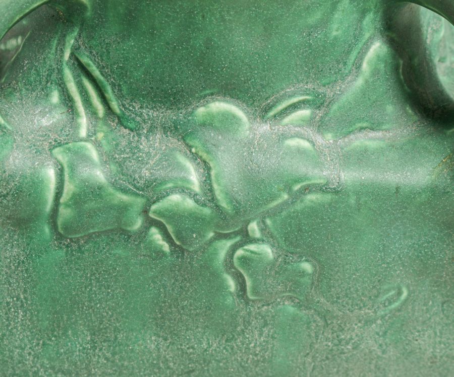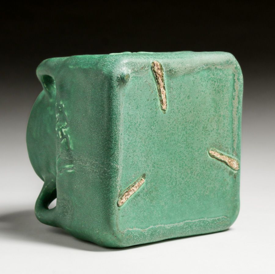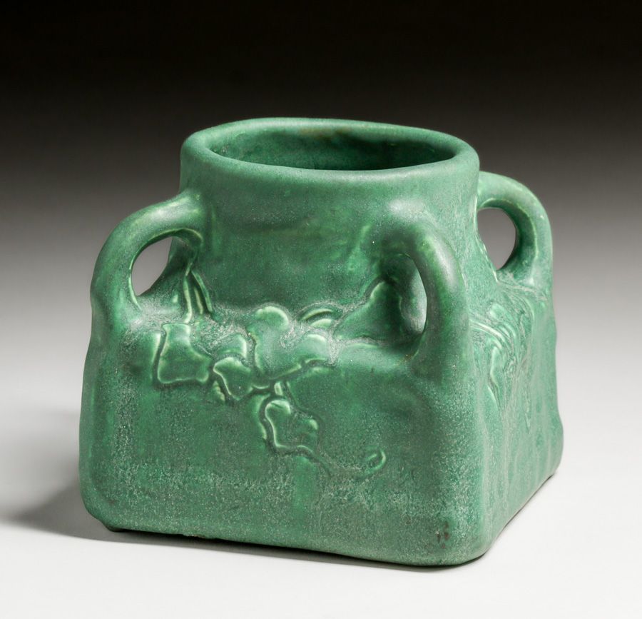 Cambridge Art Pottery Matte Green Four-Handled Vase c1910. Unsigned. Perfect condition. 5.75″h x 6″ x 6″