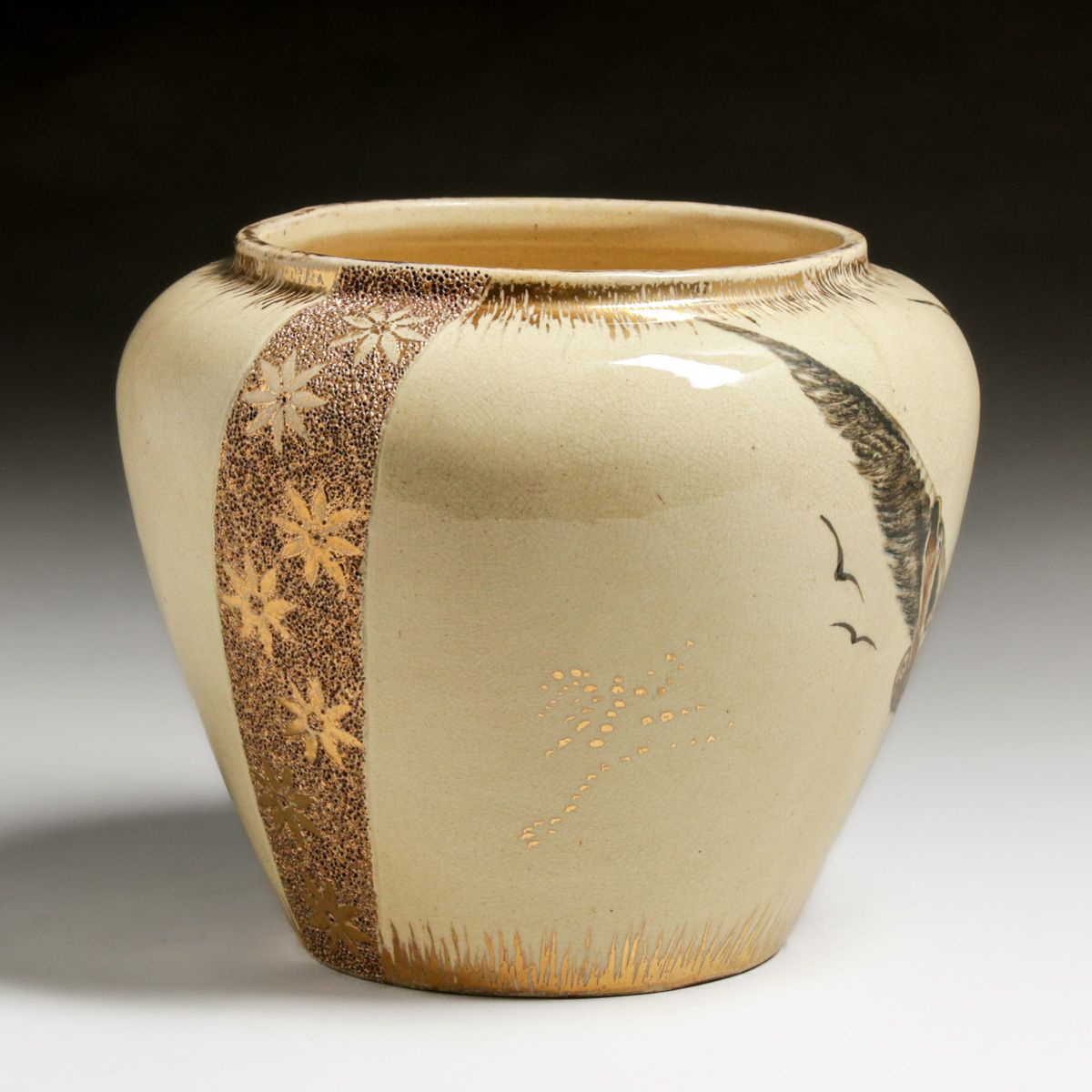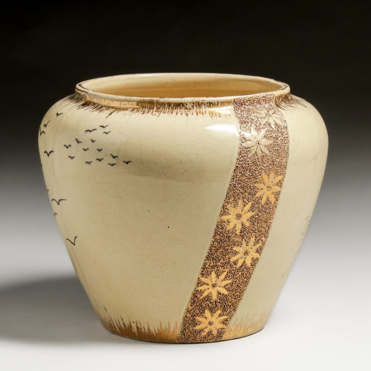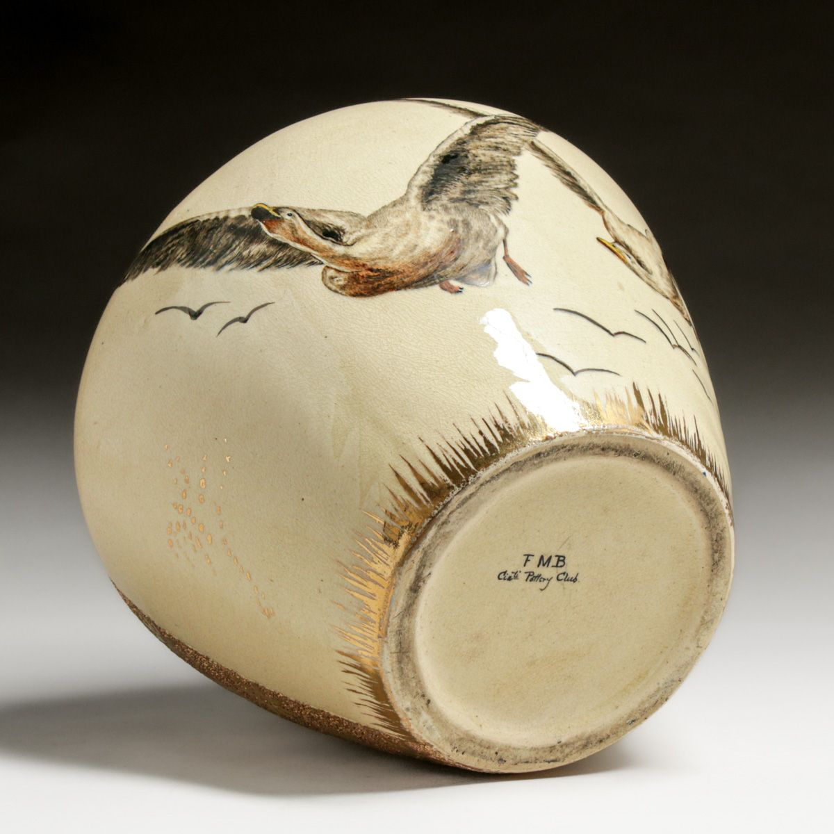 Cincinnati Pottery Club Flying Geese Jardiniere c1880s. Signed. Invisible professional restoration to two small rim chips, otherwise perfect condition. 9.25”h x 11”d