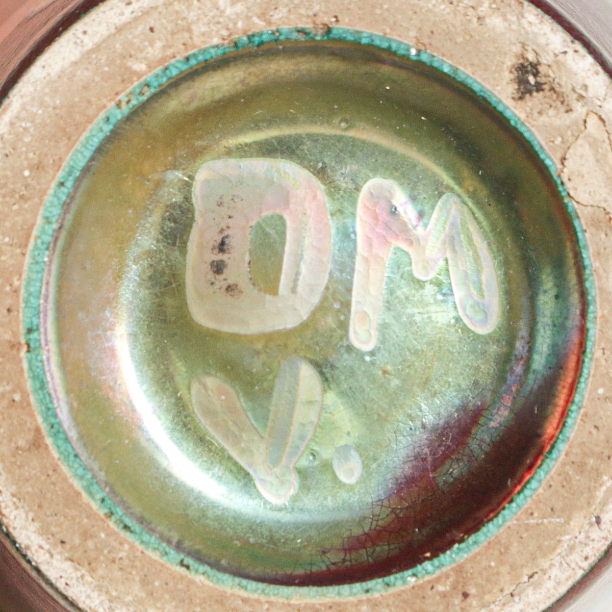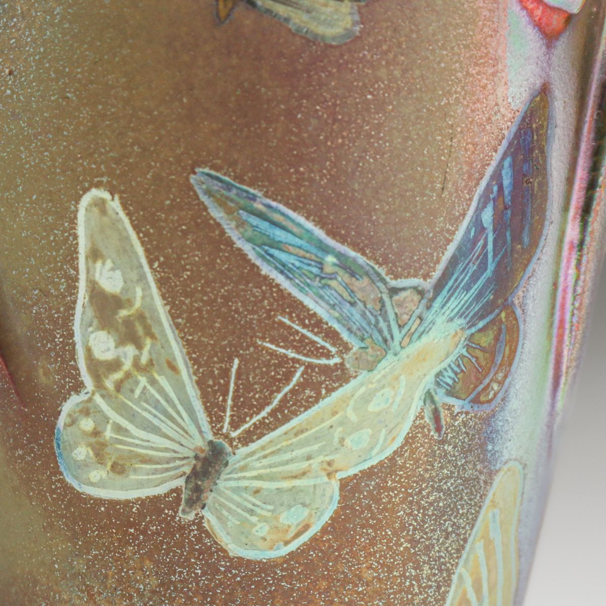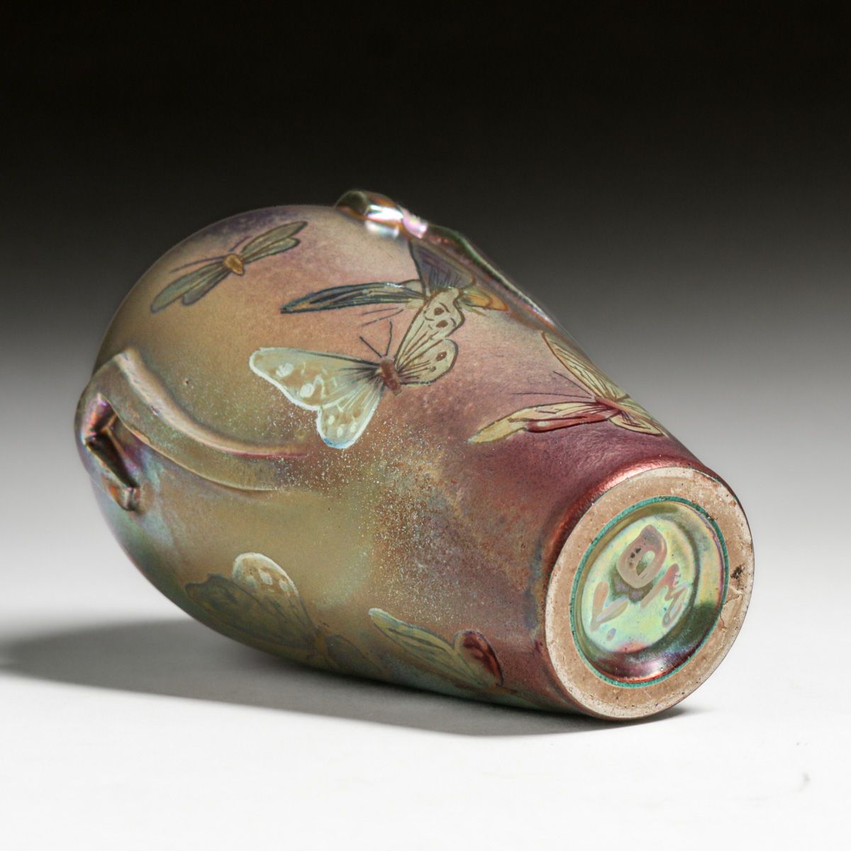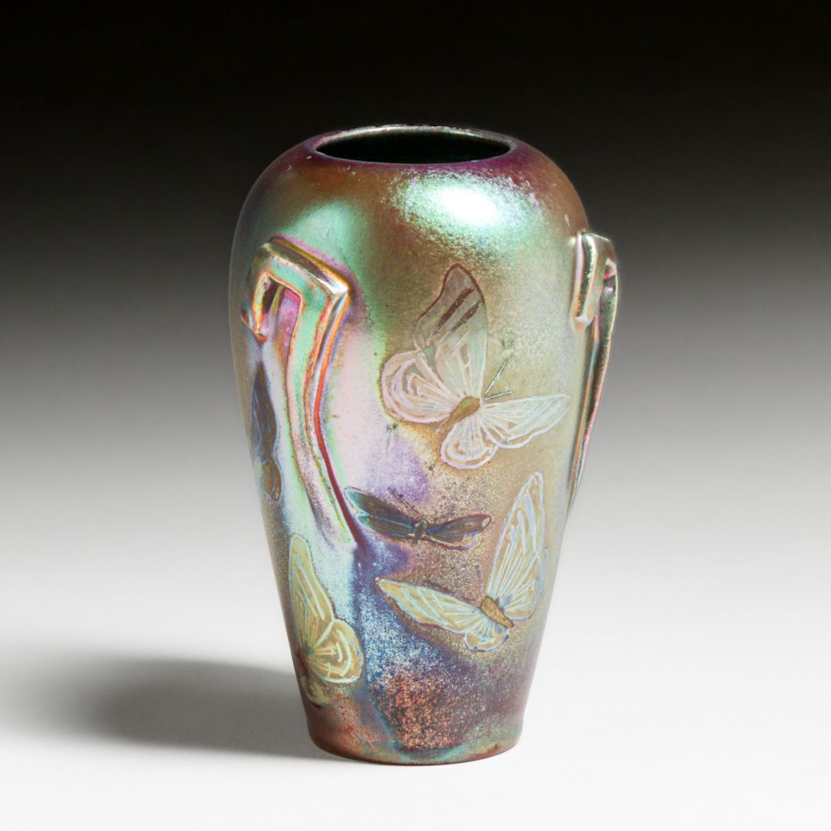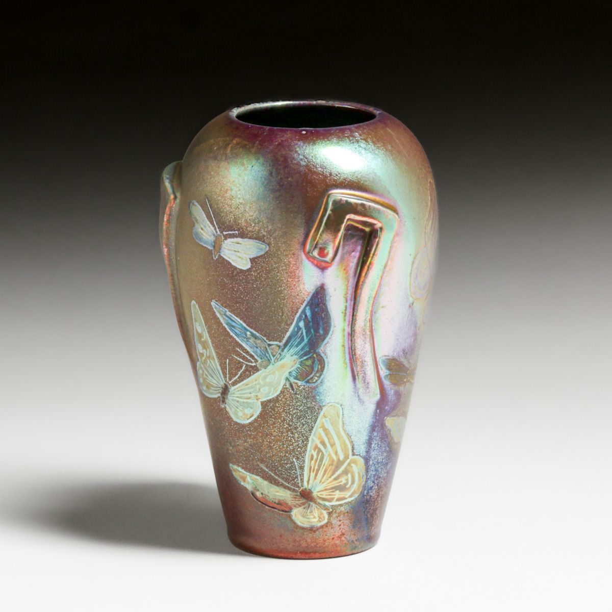 Delphin Massier (1836–1907) Art Nouveau Iridescent Butterfly Vase c1890s. Signed. Perfect condition. Delphin Massier was a French ceramist who was active during the late 19th and early 20th centuries. He was one of three members of the Massier family, along with his brother Clément and cousin Jérôme, who contributed to the revival of decorative arts and the development of Art Nouveau pottery in Vallauris, France. 5"h x 3.25"d