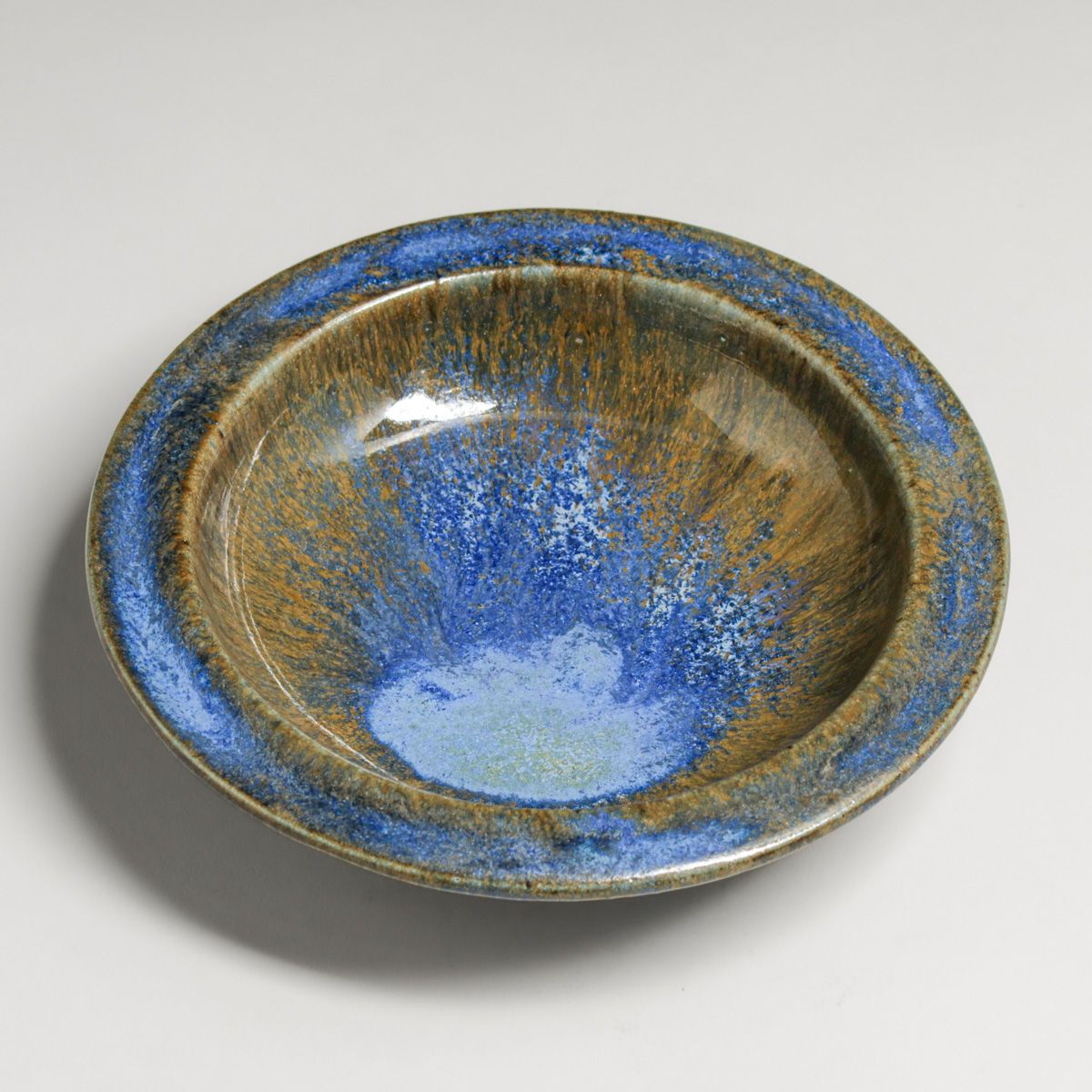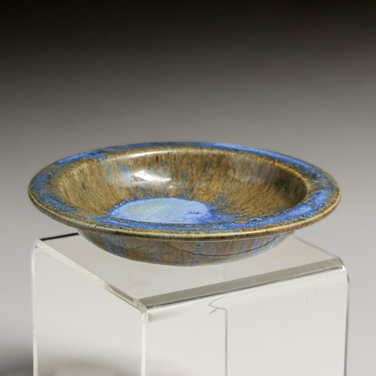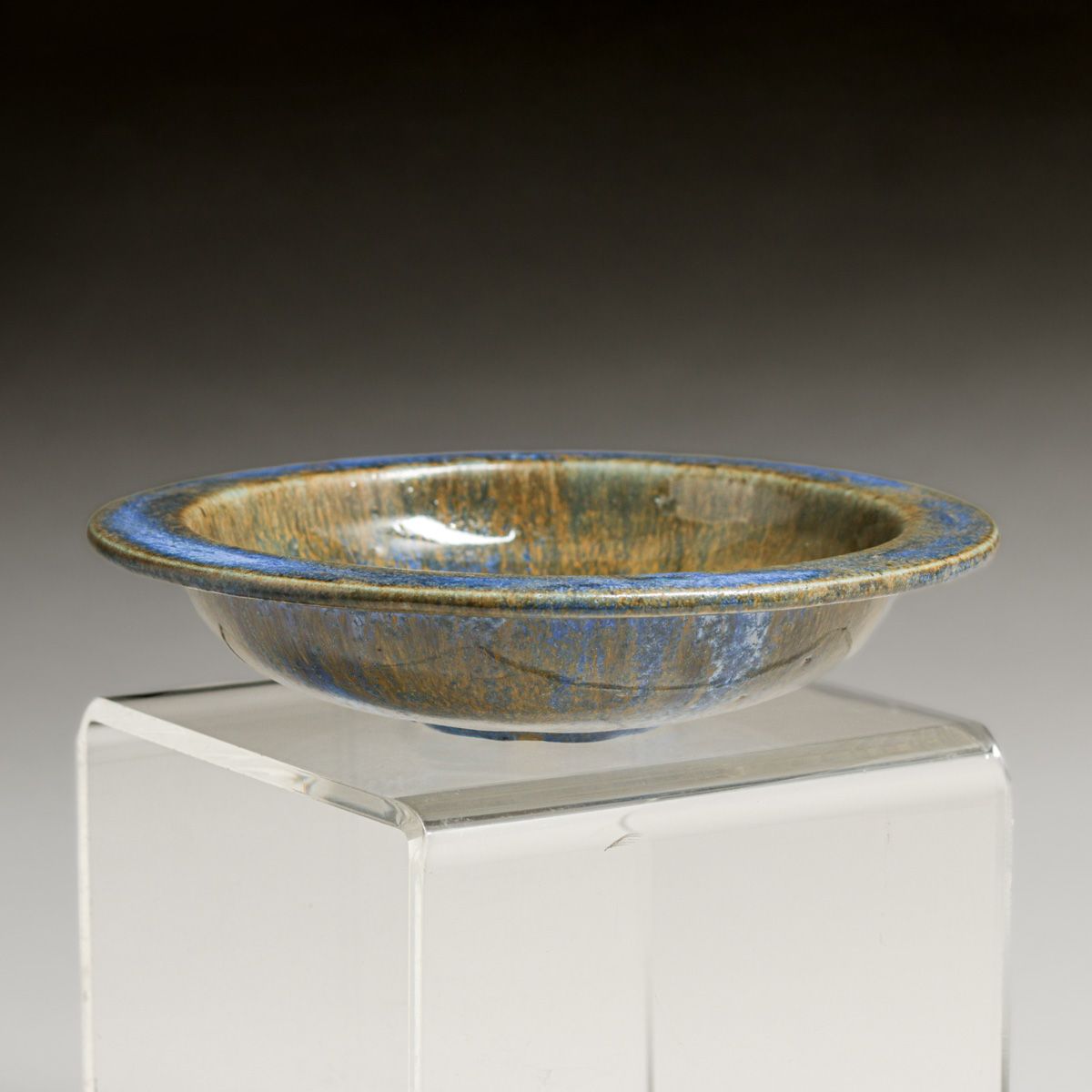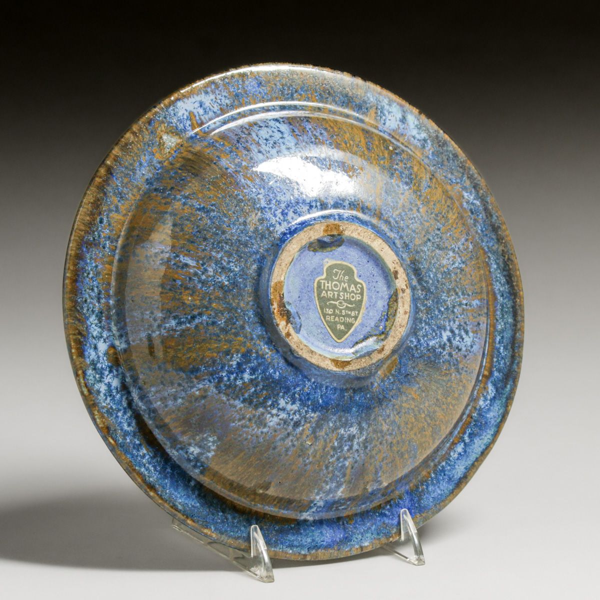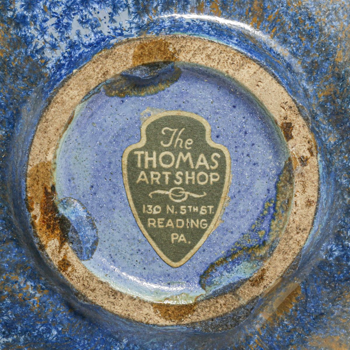 Fulper Pottery Blue Crystalline Bowl c1910s. Signed with retailer's label "The Thomas Art Shop, Reading, PA". Likely signed Fulper under label. Perfect condition. 9"w x 2.25"h