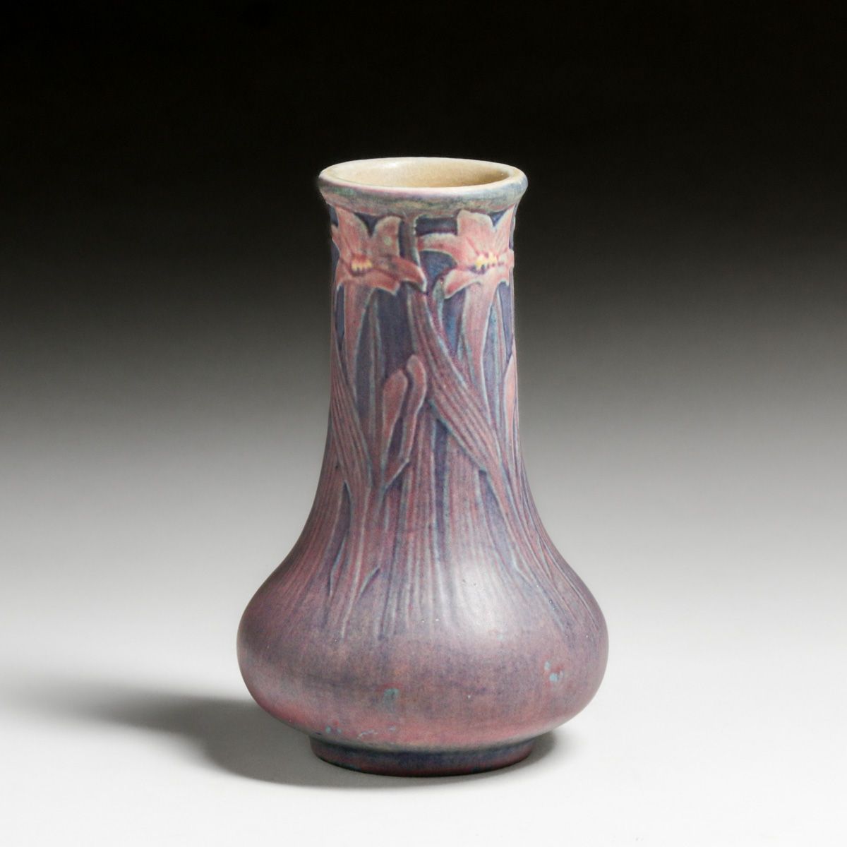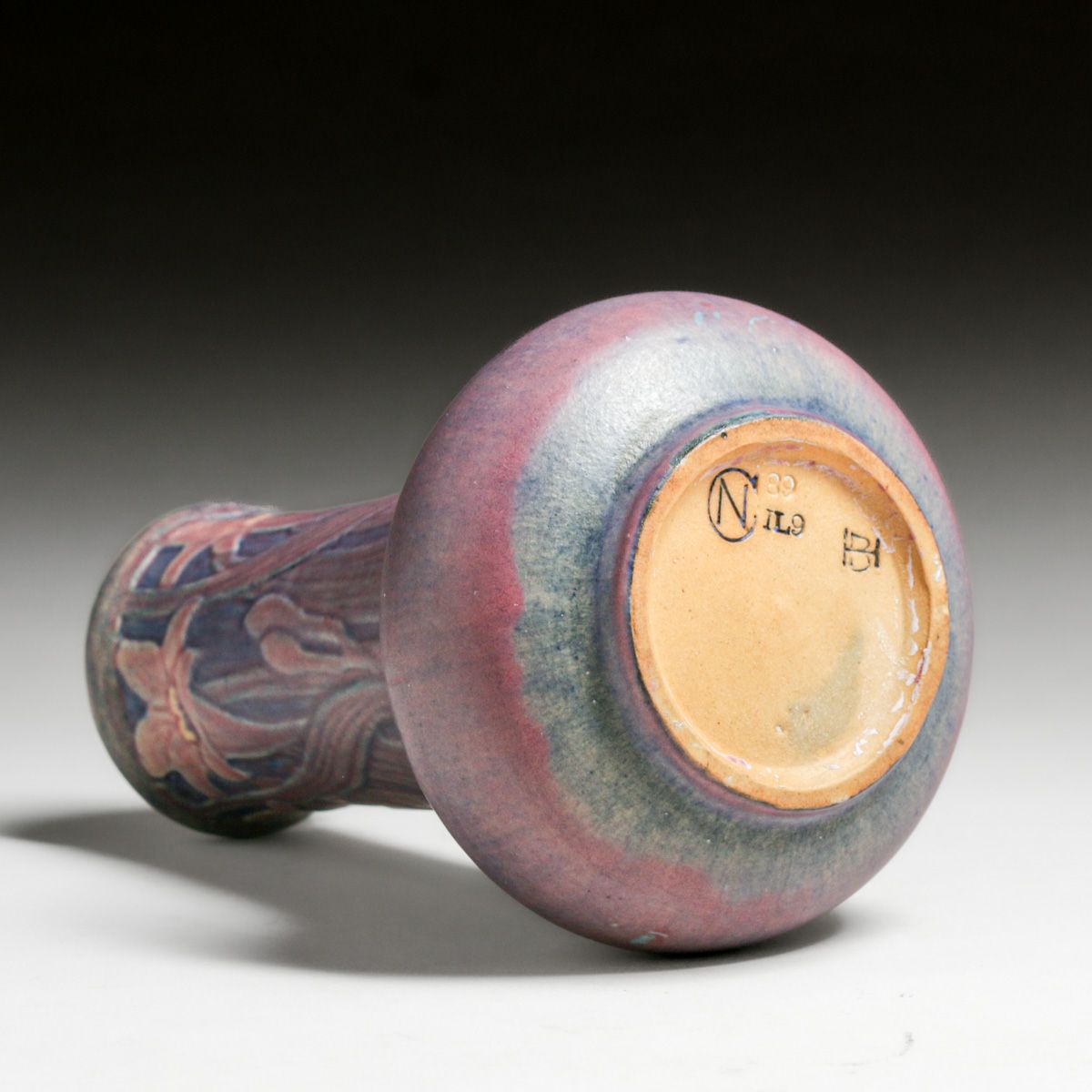 Newcomb College Henrietta Bailey Carved Iris Vase 1916. Signed. Perfect condition. 6"h x 4"d