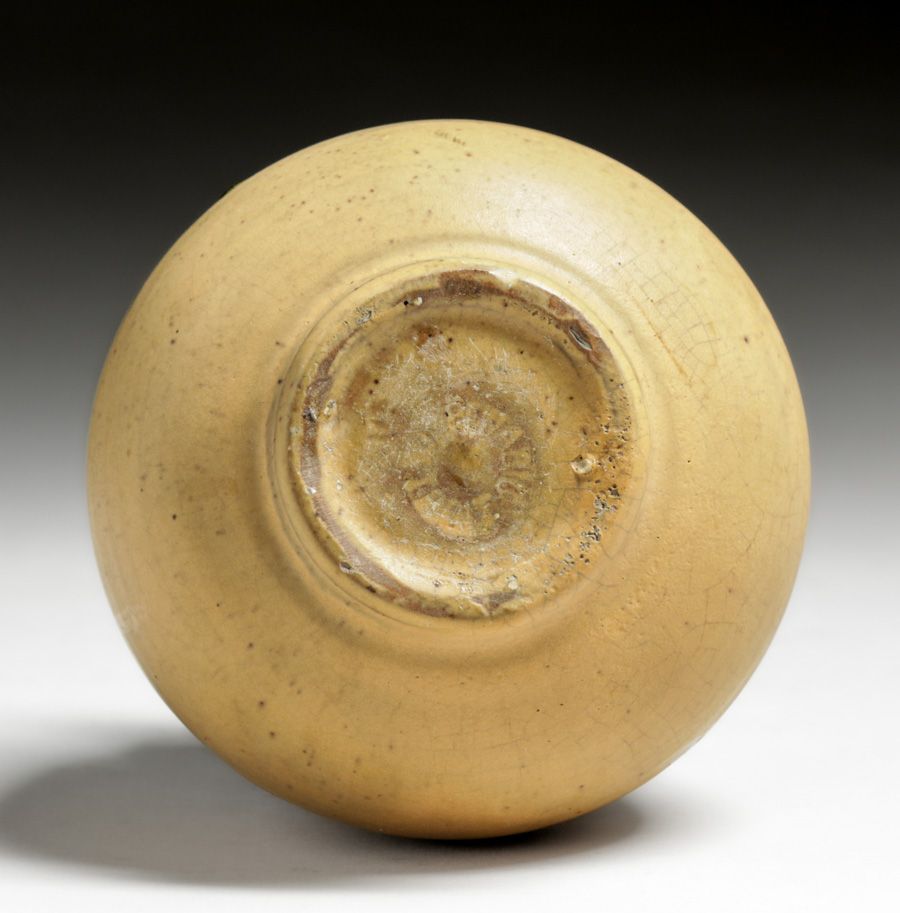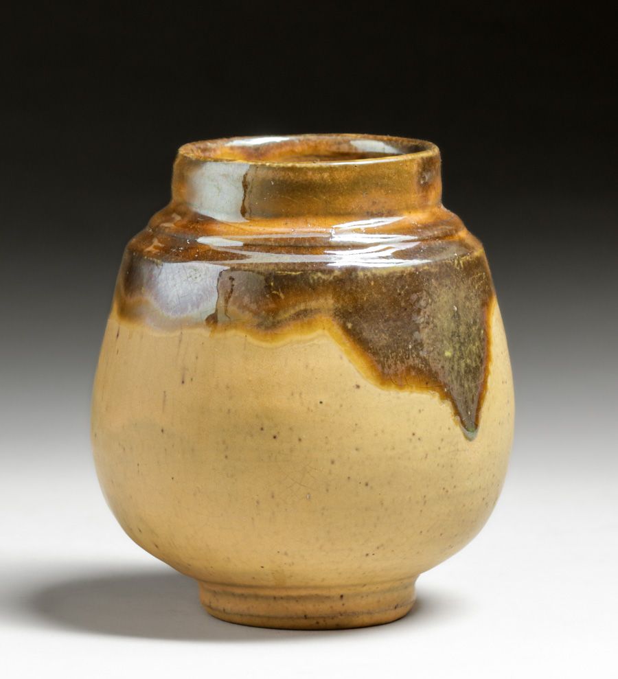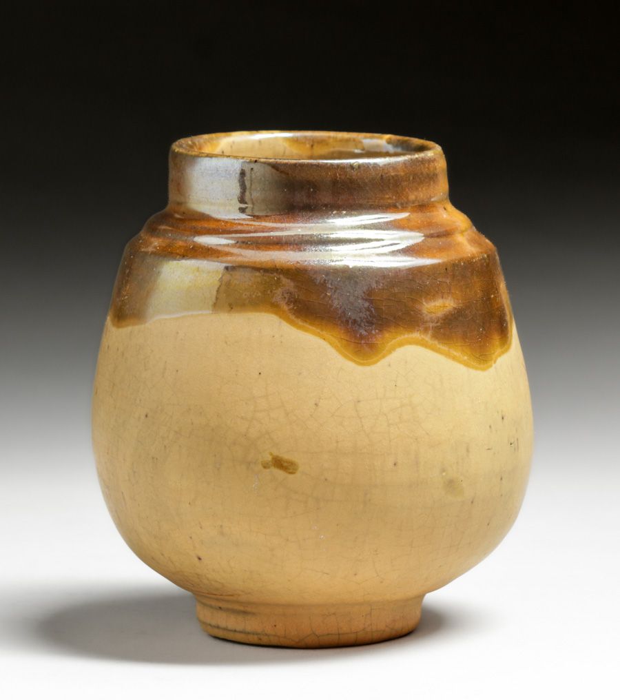 Pewabic Pottery Iridescent Gold & Matte Mustard Vase c1920s. Signed. Invisible professional restoration to tight small hairline, otherwise perfect condition. 4 7/8"h x 4"d