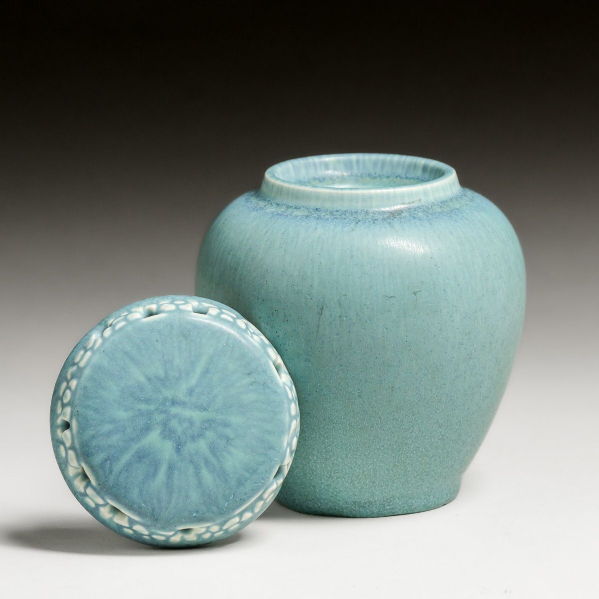 Rookwood Pottery #1321 Matte Turquoise Covered Vase 1920. Signed. Perfect condition.