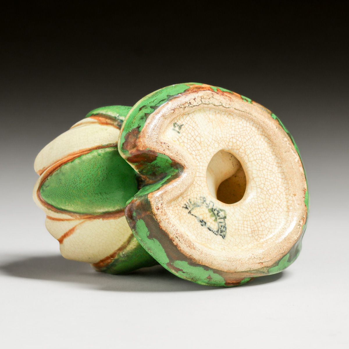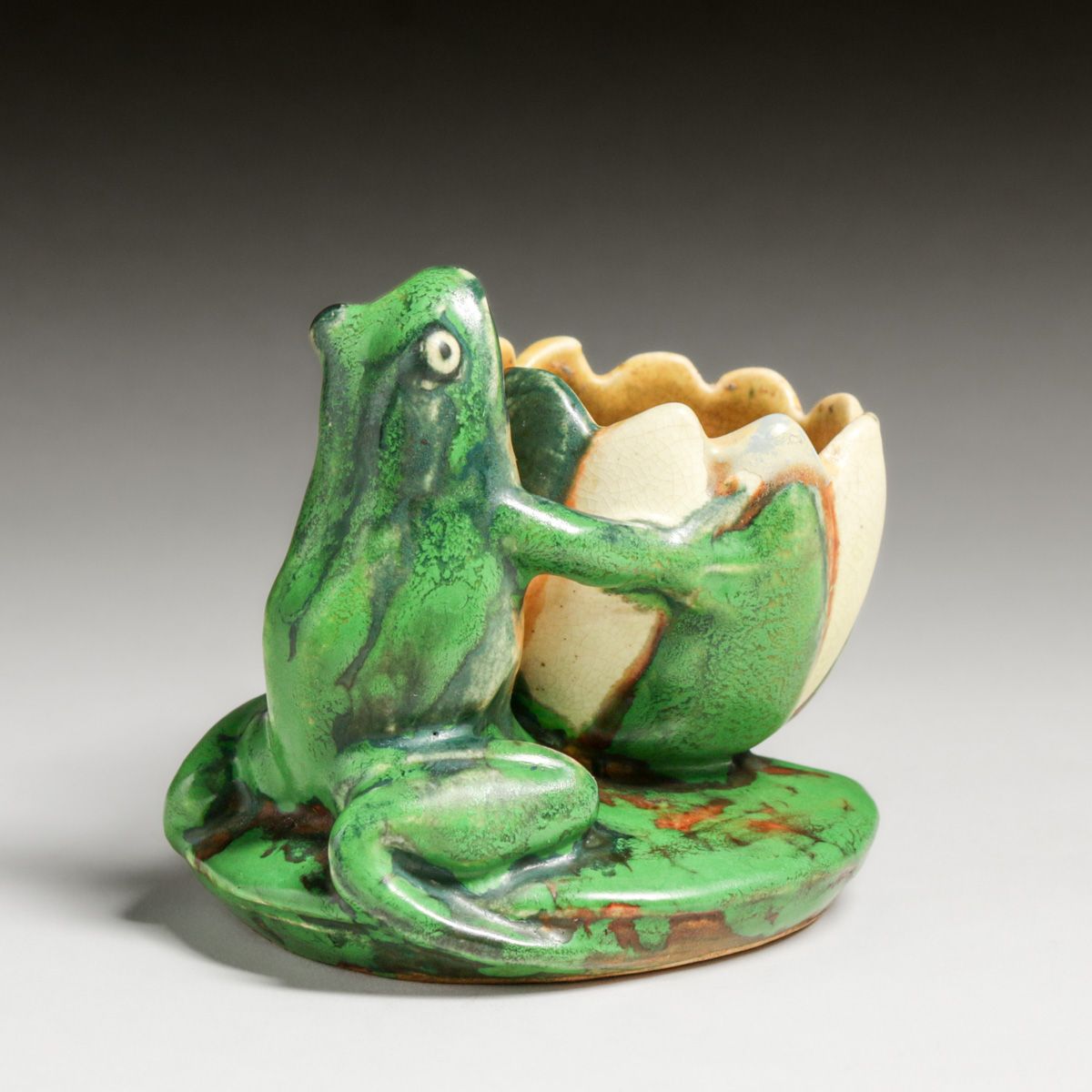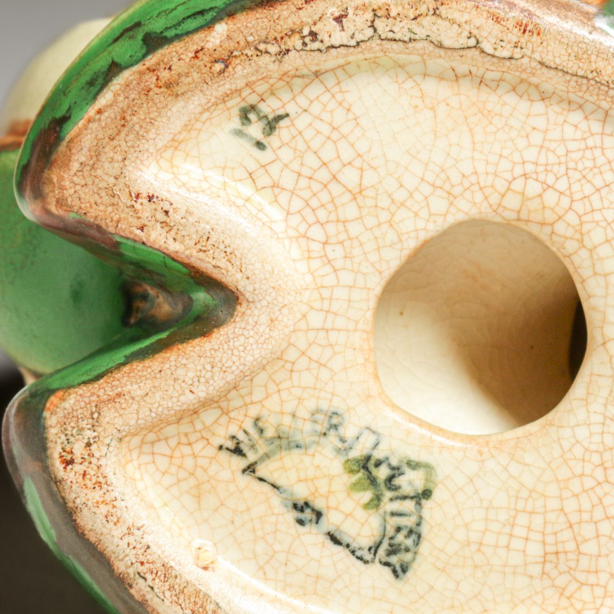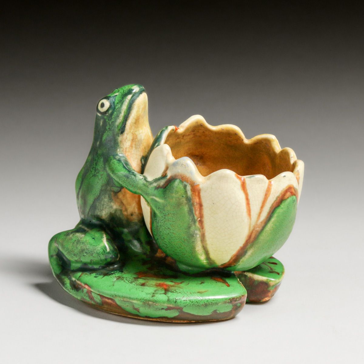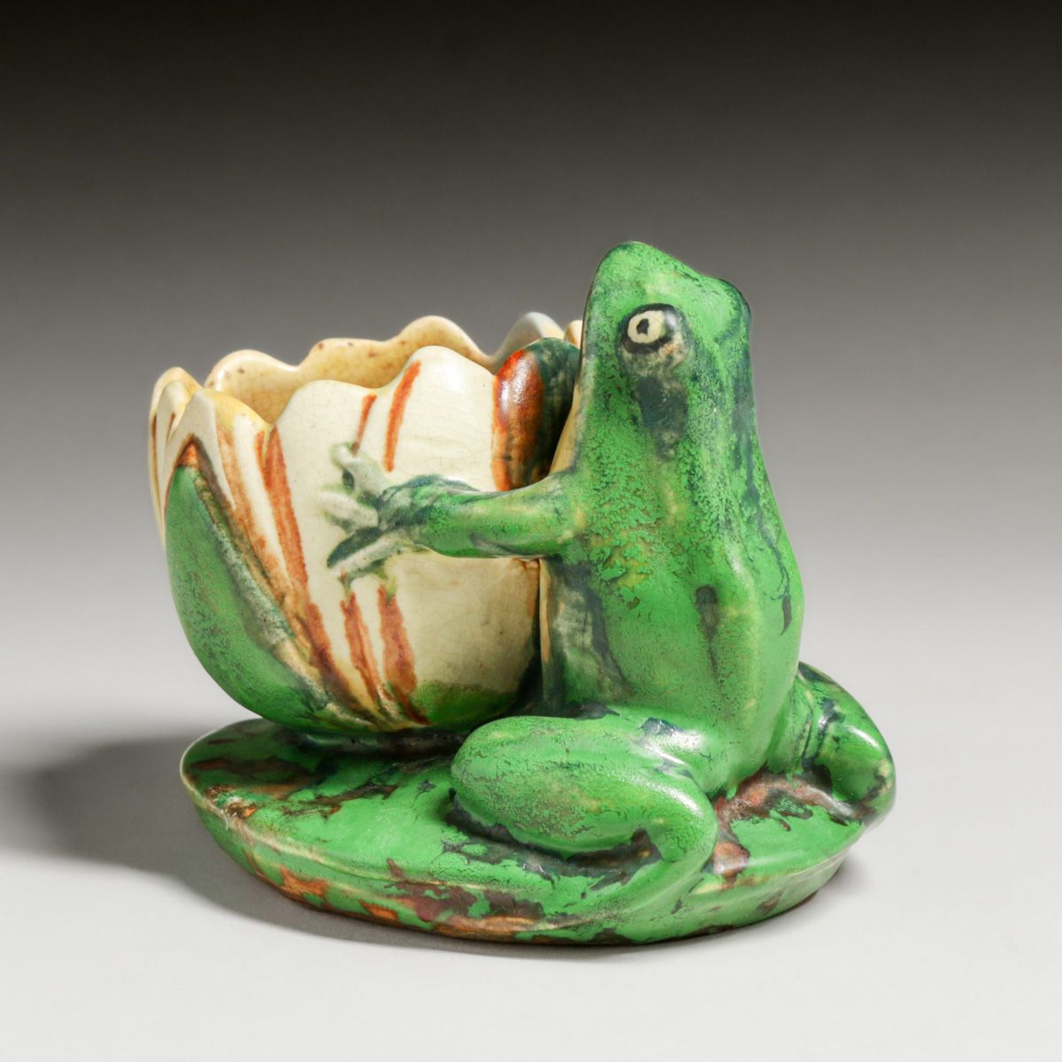 Weller Coppertone Frog & Lily Pad Candlestick c1910s. Signed. Perfect condition. 3.75"h x 5"w x 3.5"d