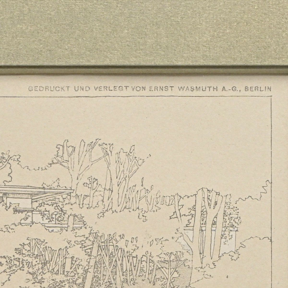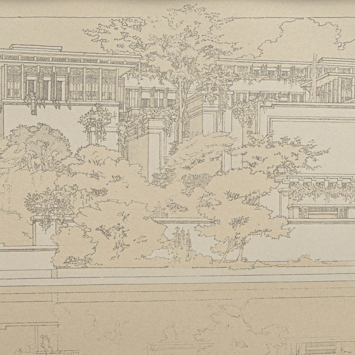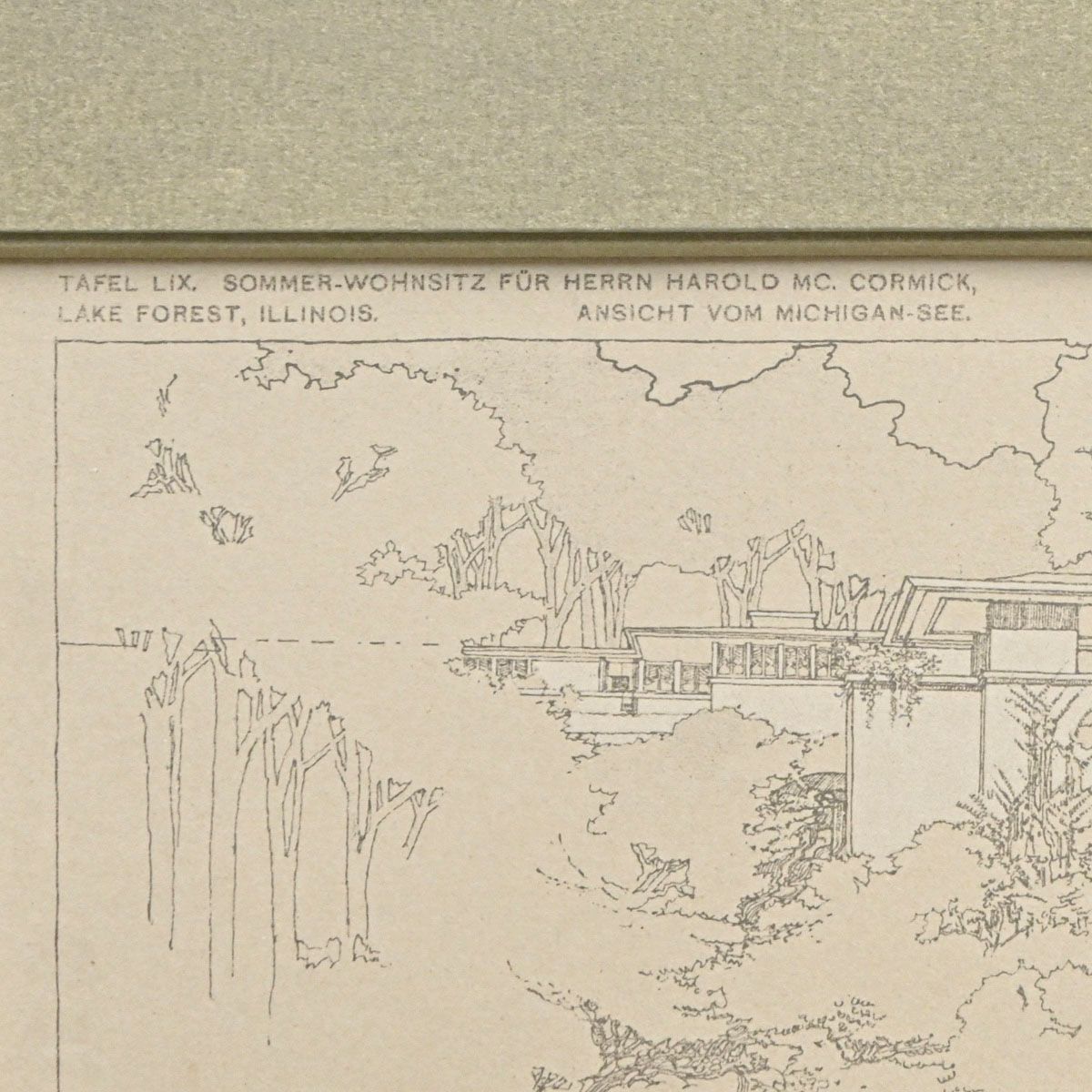 Frank Lloyd Wright Wasmuth Portfolio Litho Summer Residence for Harold McCormick, View from Lake Michigan, 1910. Signed with the embossed square signature lower left. Excellent condition. 13"h x 21.75"w. Frame 21"h x 30"w While the architectural design is Wright's, the exquisite pen-and-ink rendering is widely attributed to his senior assistant, Marion Mahony Griffin. Her unique graphic style, characterized by delicate line work and East Asian artistic influences, was instrumental in the portfolio's massive success and subsequent influence on European modernists like Le Corbusier and Mies van der Rohe.