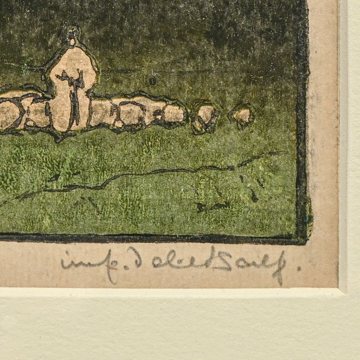 - Elizabeth Christie Austen-Brown (British 1869-1942) Color Woodcut "Shepherd and Sheep at Dusk" c1920