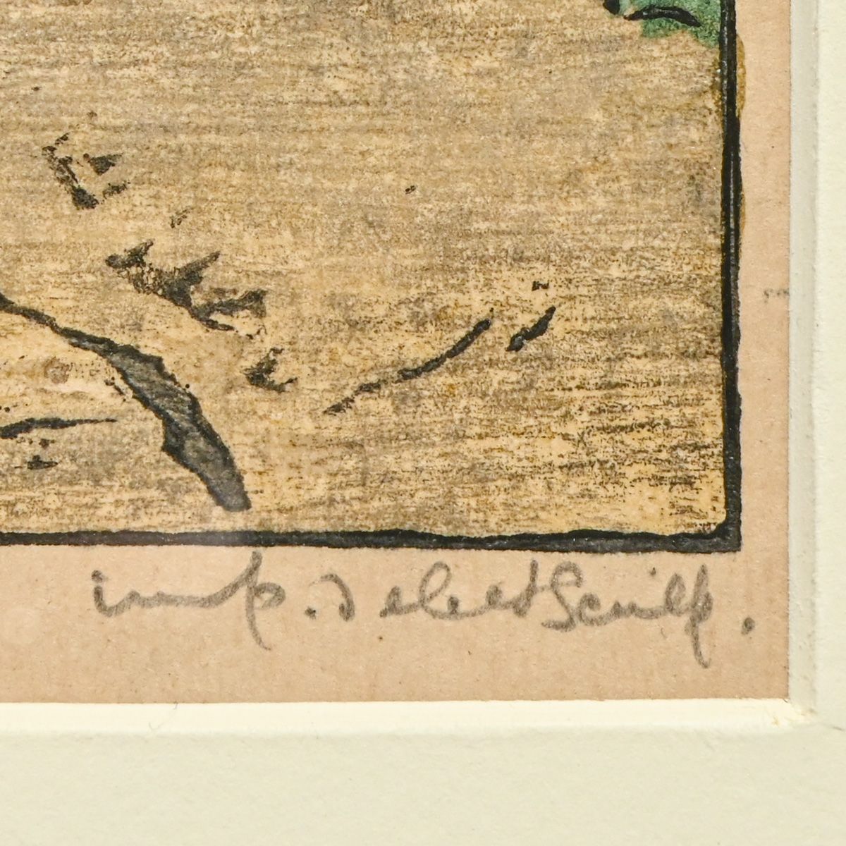 Elizabeth Christie Austen-Brown (British 1869-1942) Color Woodcut "Shepherd and Sheep" c1920. Signed. Excellent condition. 5.25"h x 4.75"w. Frame 12"h x 10"w