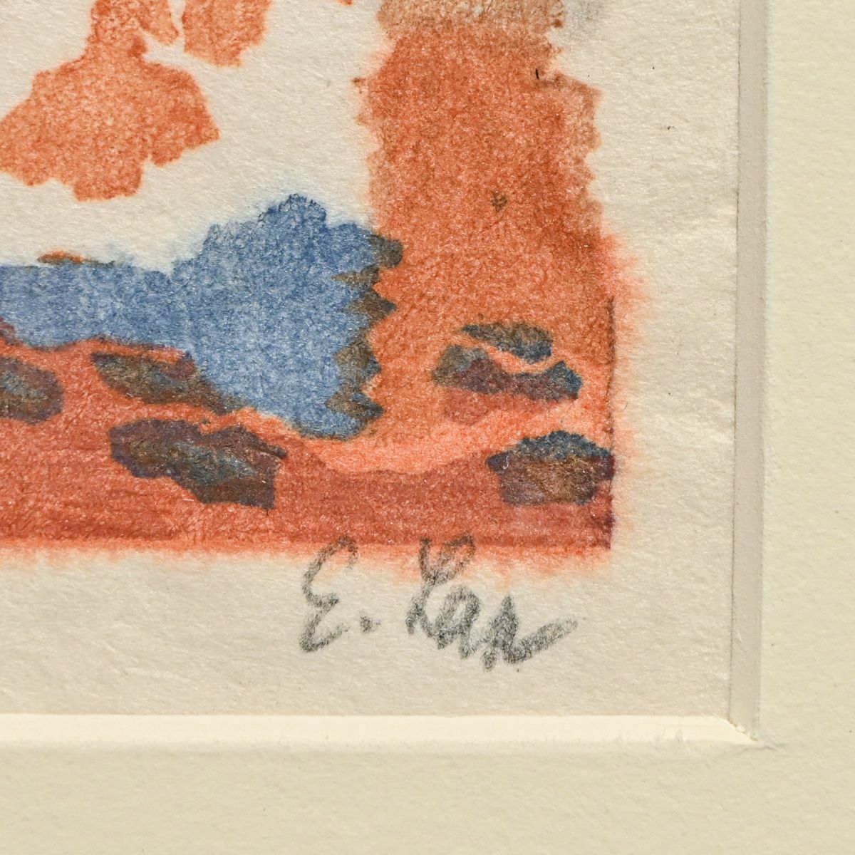 Engelbert Lap (Austrian 1886-1970) Color Woodcut: Tall Pine in Mountains c1925. Signed. Excellent condition. 5.5"h x 3.5"w. Frame 15.5"h x 10.5"w