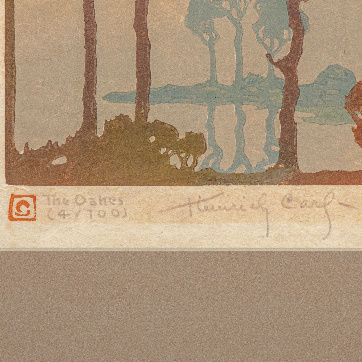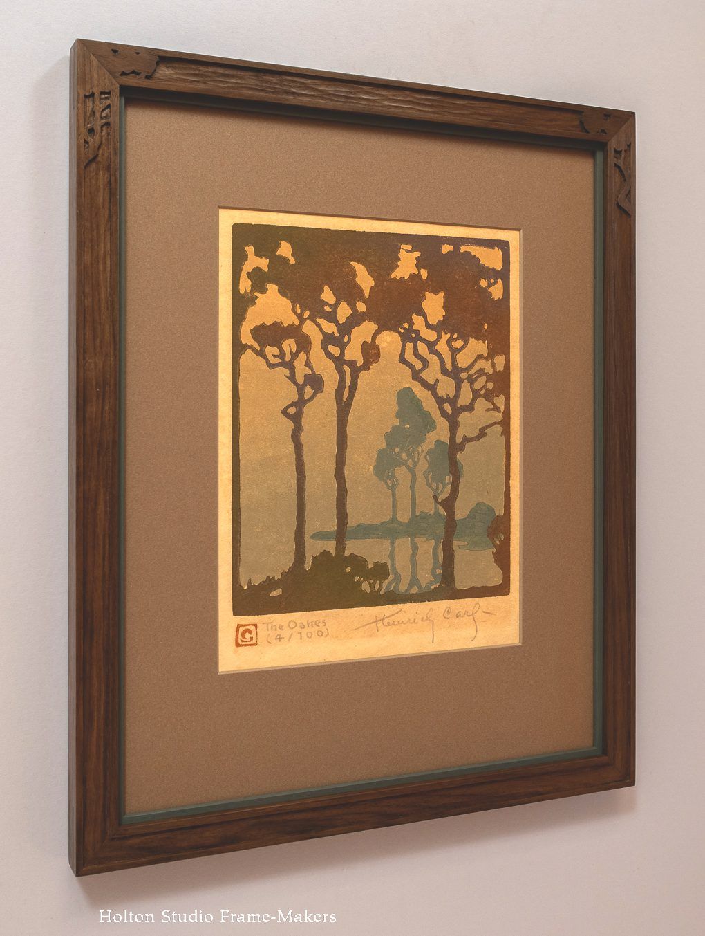 Heinrich Carl Color Woodcut "The Oakes" c1920. Not much is known about Heinrich Carl. Such a talented artist without any biographical information. May have been a student of either Arthur Wesley Dow or Pedro Lemos. Signed. Excellent condition. Tim Holton hand carved custom frame. 9.75"h x 8"w. Frame 19.5"h x 16"w
