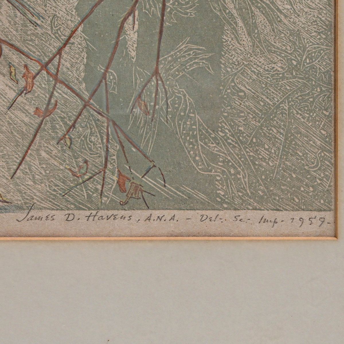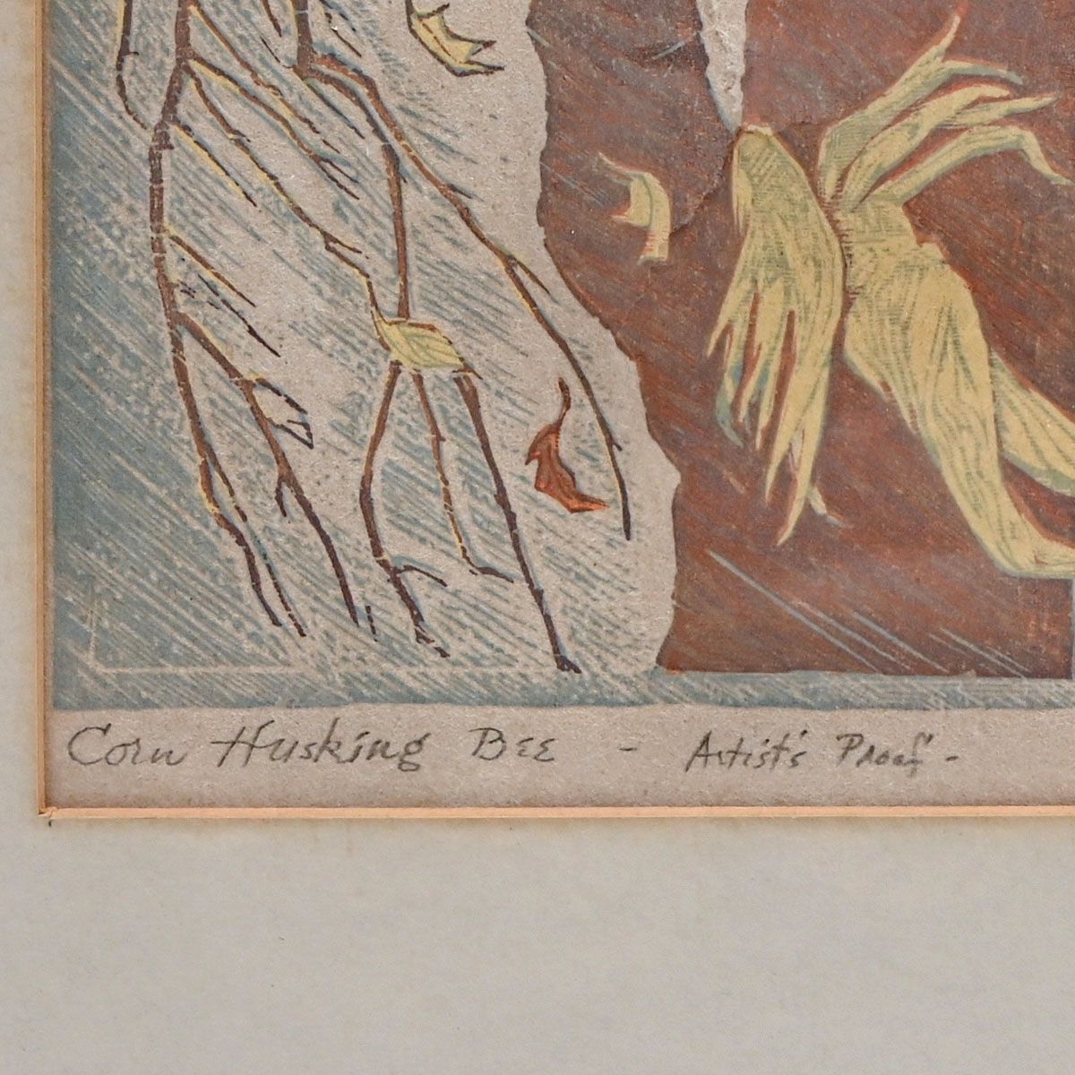 James Dexter Havens (1900–1960) Color Woodcut "Corn Husking Bee" 1959. Signed and Inscribed "Artist's Proof". Excellent condition. 8.25"h x 12.25"w. Frame 15 1/8"h x 18.25"w